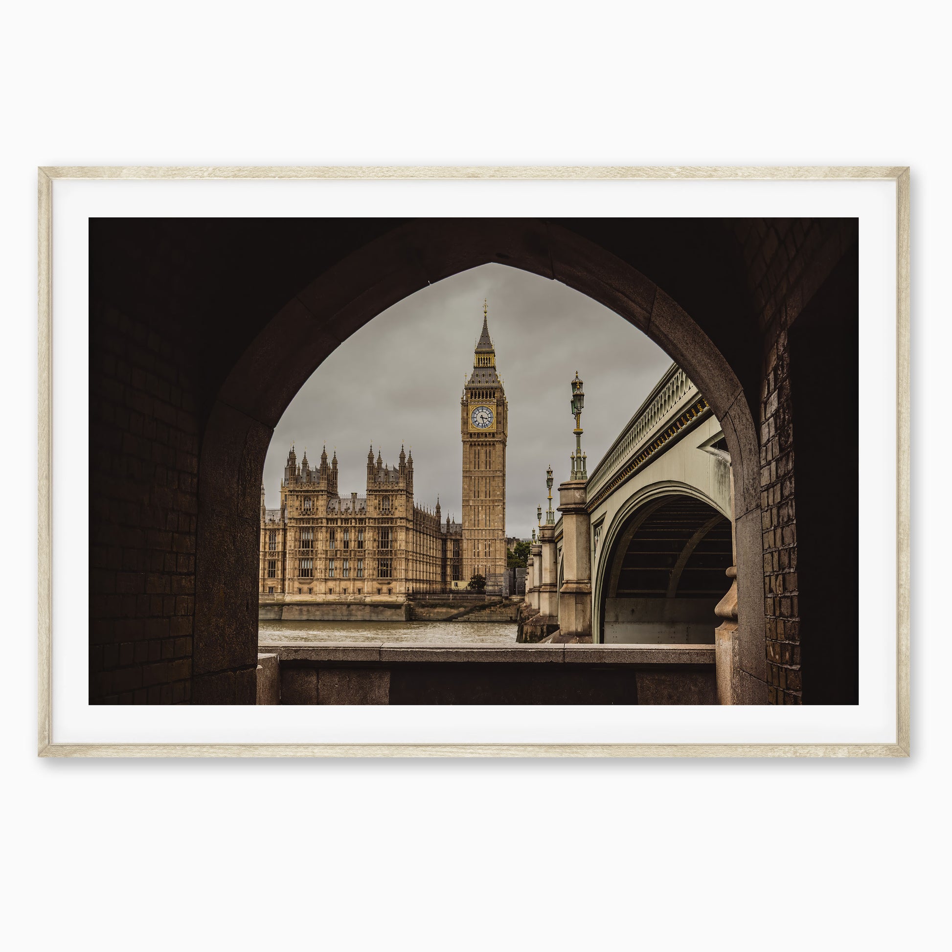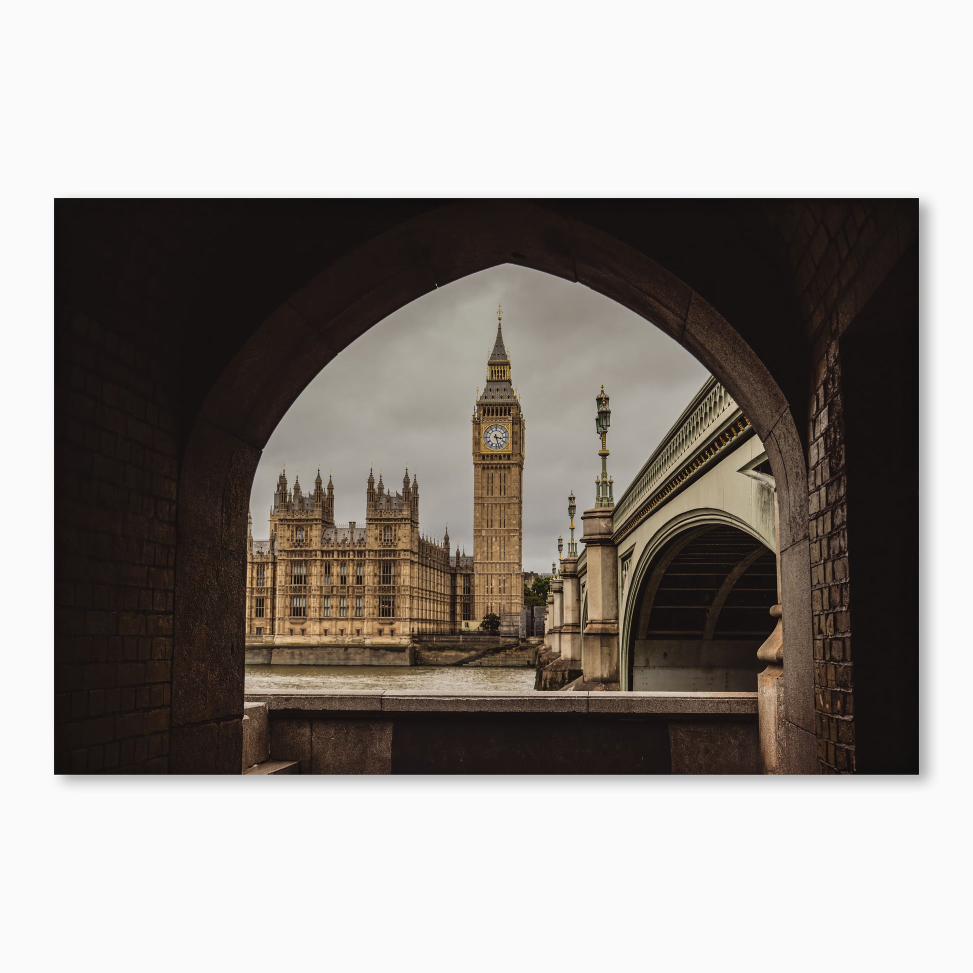 An iconic view of London’s Big Ben and the Houses of Parliament, perfectly framed by the archway beneath Westminster Bridge. This classic scene captures the contrast of shadow and light, old and new, and the stillness of a moment in one of the world’s busiest cities. A timeless piece for lovers of London, architecture, or that magical feeling of discovering a postcard-perfect view by chance.