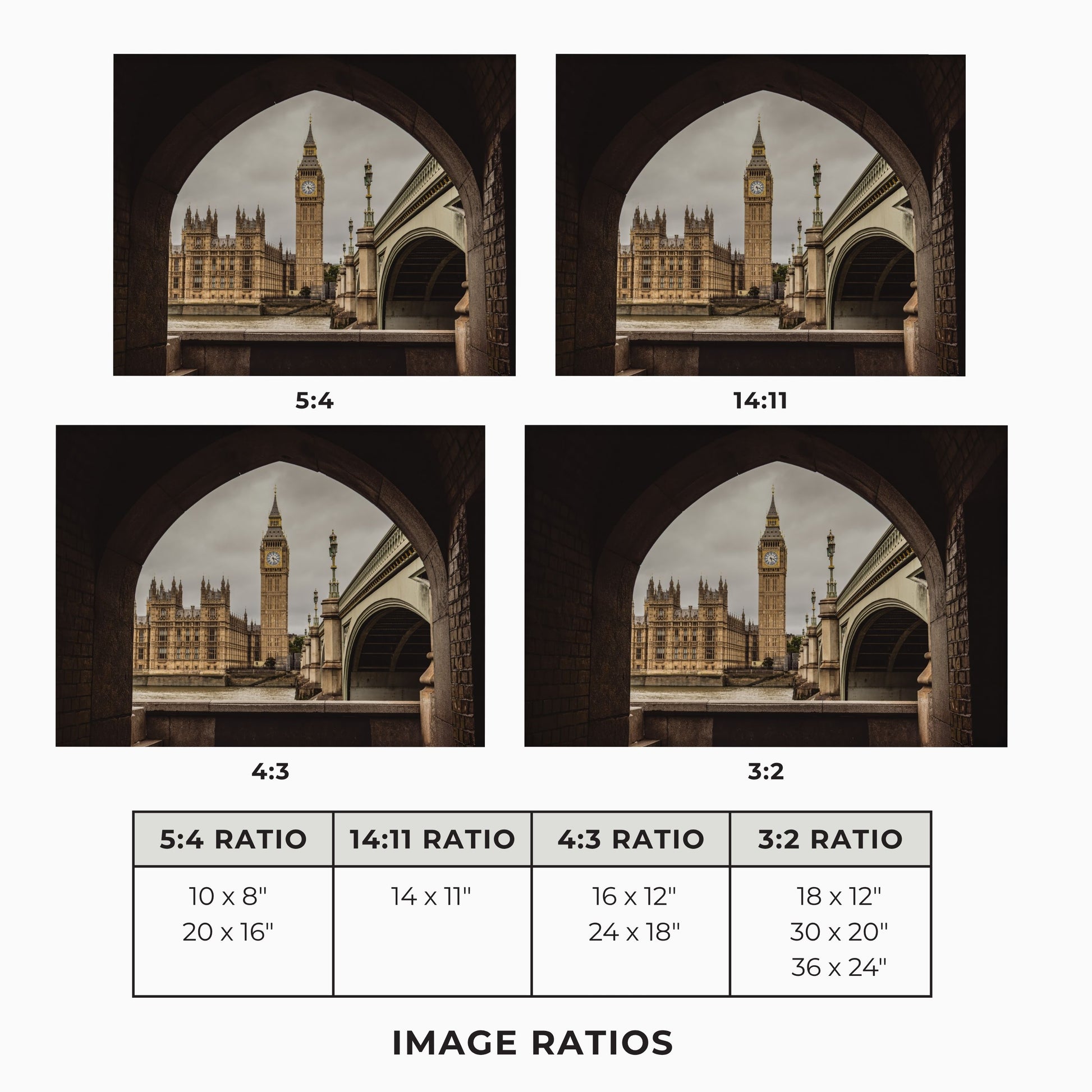 The print sizes available are designed to fit a variety of ready-made frame sizes that are available in stores. These different sizes will result in cropping of the original image. To ensure you're happy with the final look, please refer to the example image of how the artwork will appear in each size option.