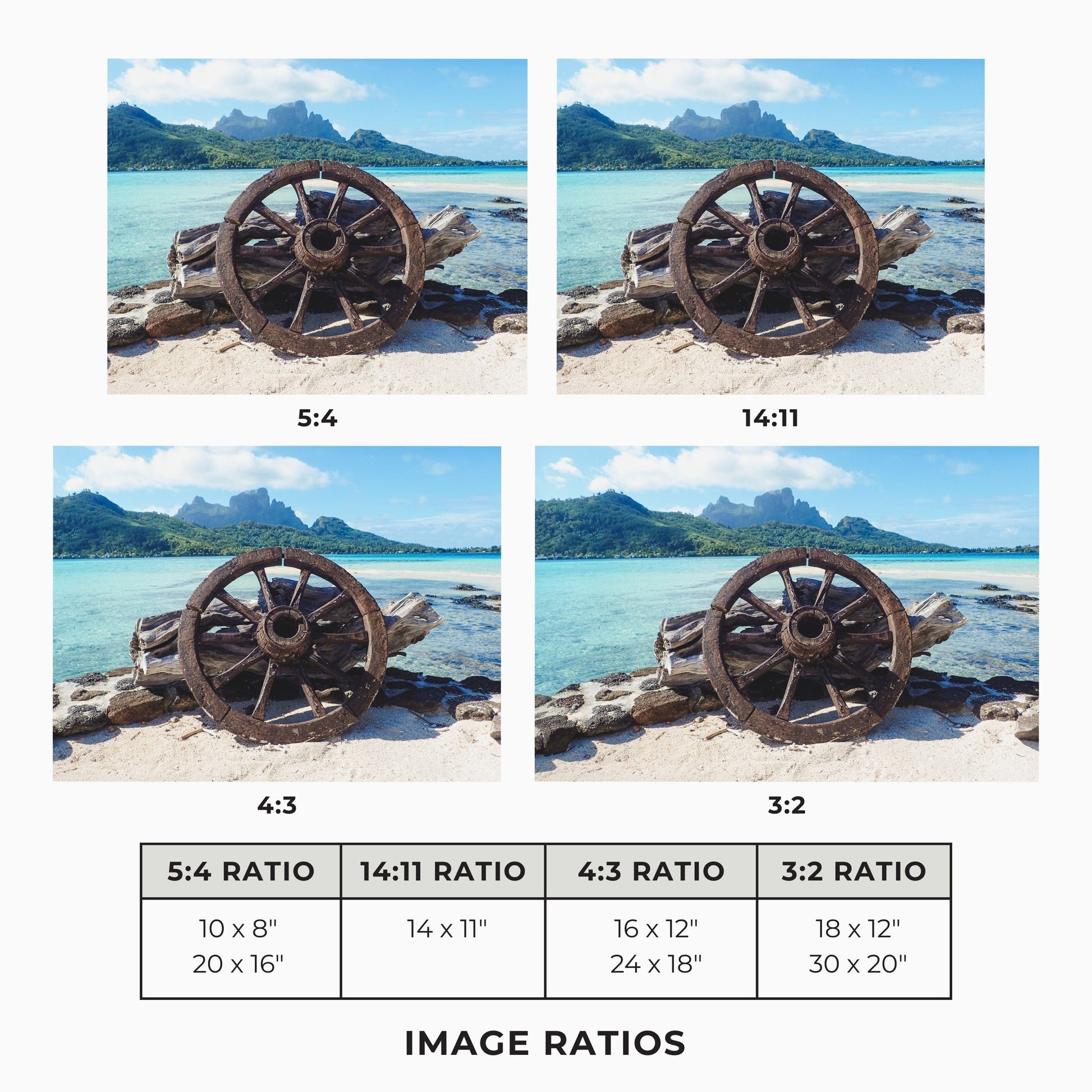 The print sizes available are designed to fit a variety of ready-made frame sizes that are available in stores. These different sizes will result in cropping of the original image. To ensure you're happy with the final look, please refer to the example image of how the artwork will appear in each size option.