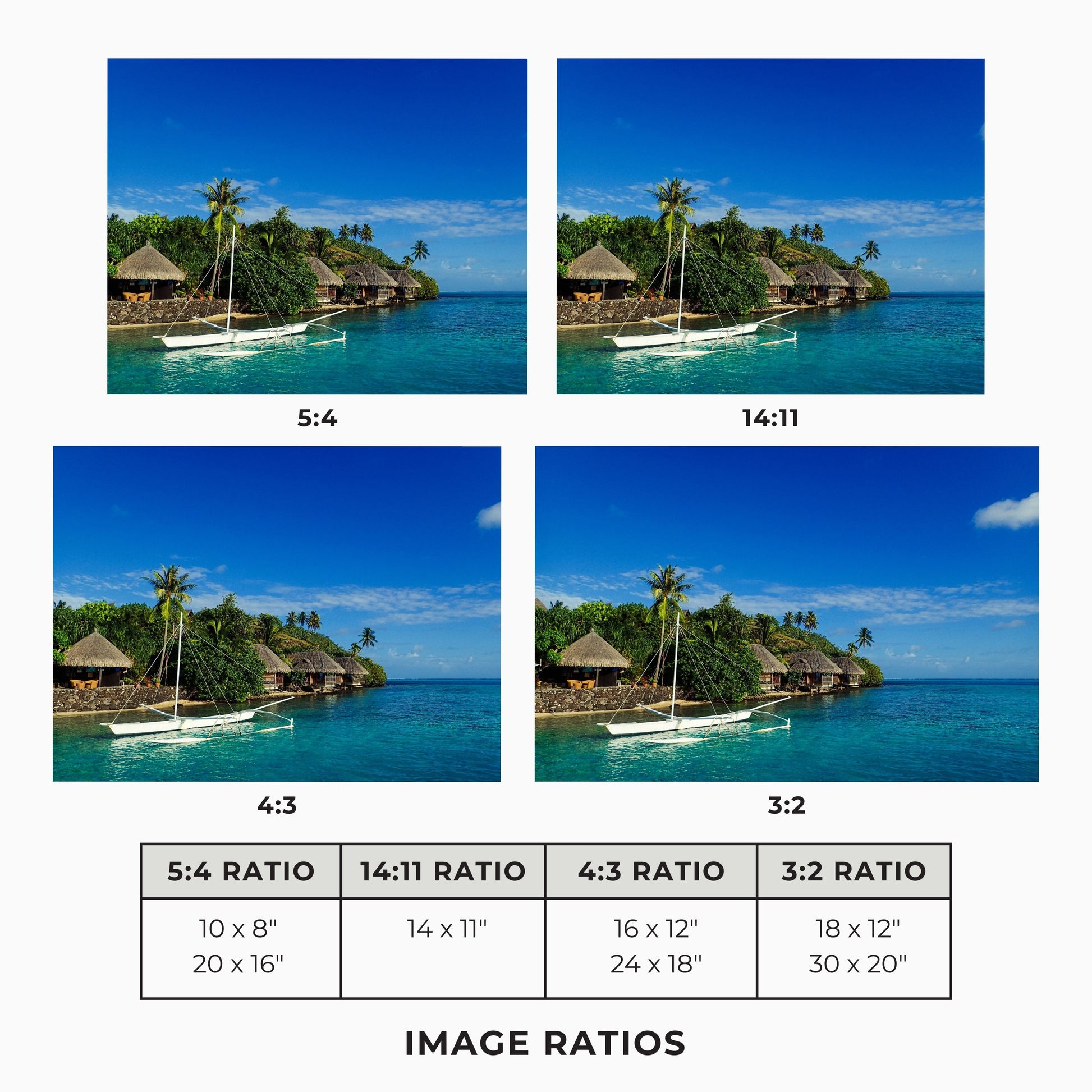 The print sizes available are designed to fit a variety of ready-made frame sizes that are available in stores. These different sizes will result in cropping of the original image. To ensure you're happy with the final look, please refer to the example image of how the artwork will appear in each size option.