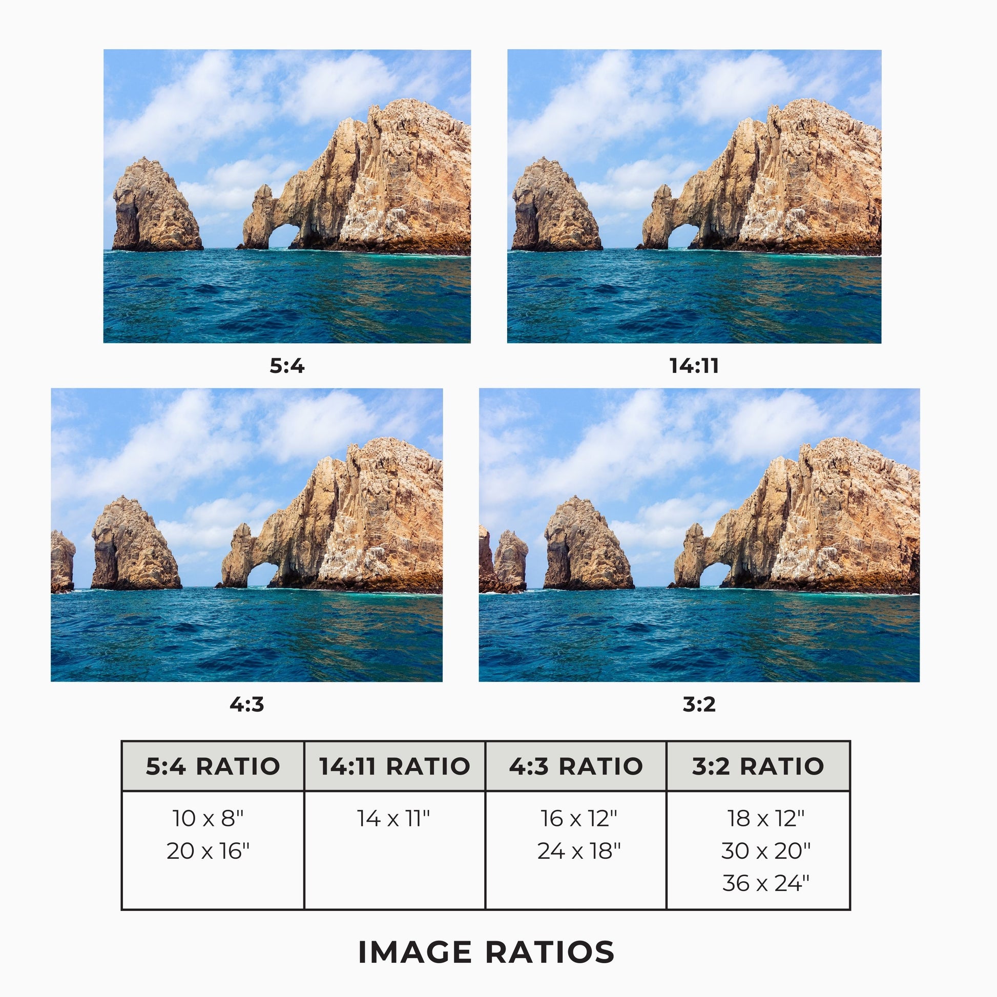 The print sizes available are designed to fit a variety of ready-made frame sizes that are available in stores. These different sizes will result in cropping of the original image. To ensure you're happy with the final look, please refer to the example image of how the artwork will appear in each size option.