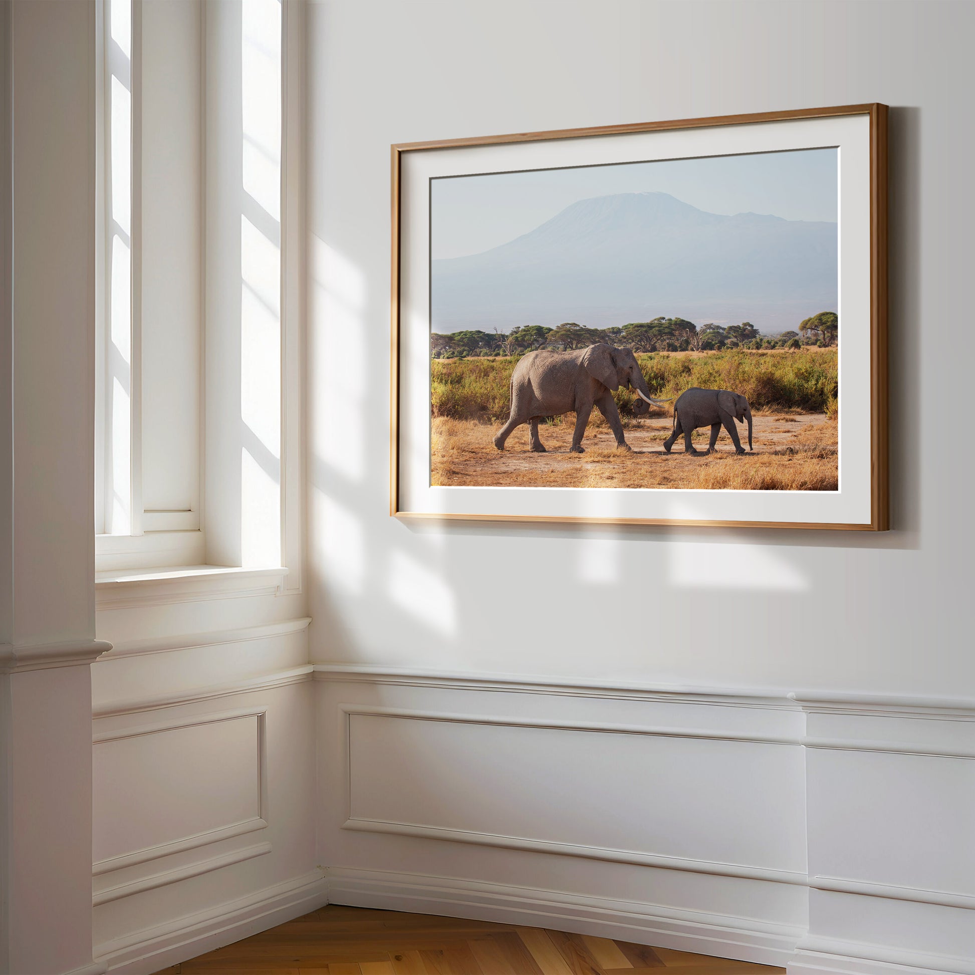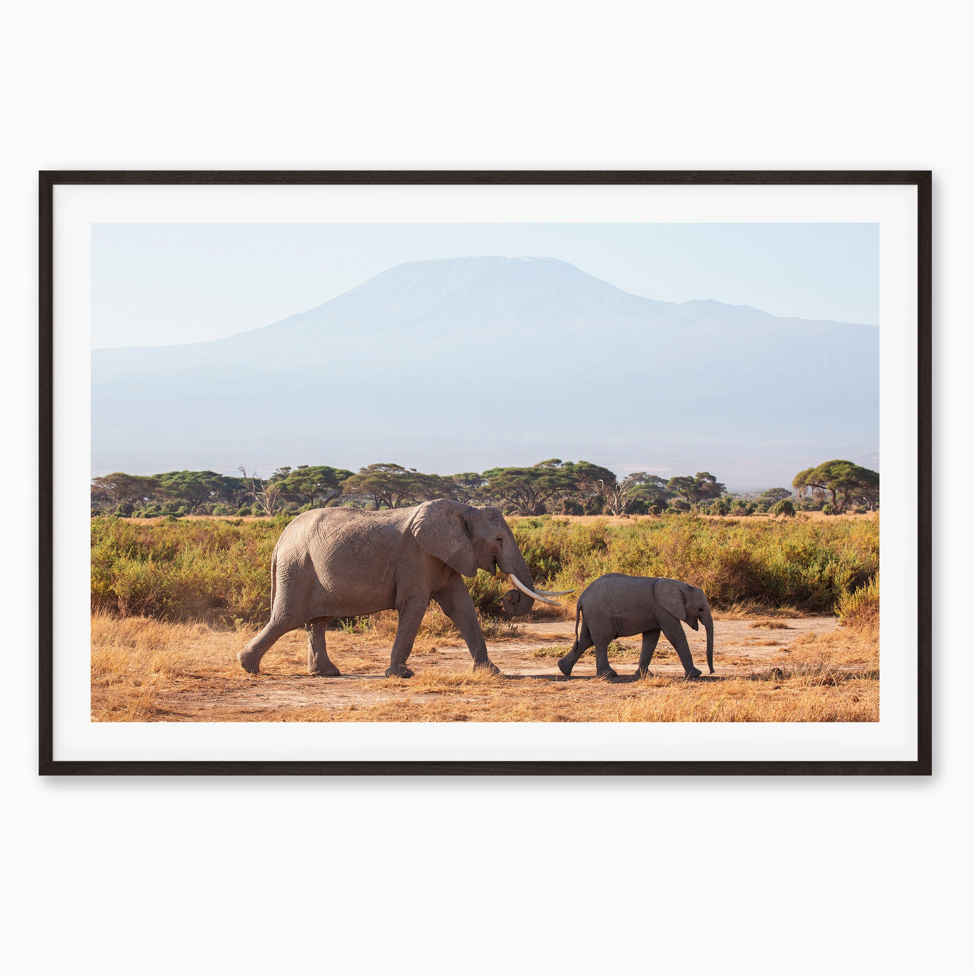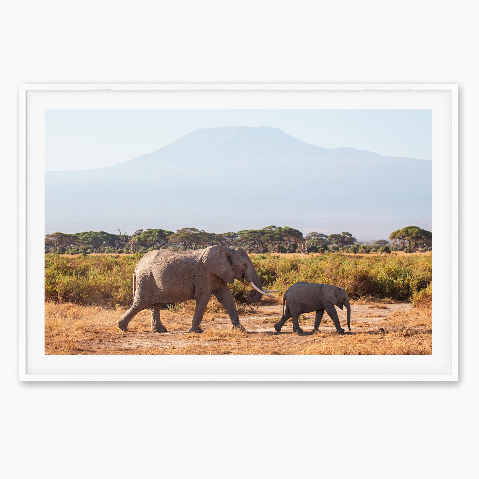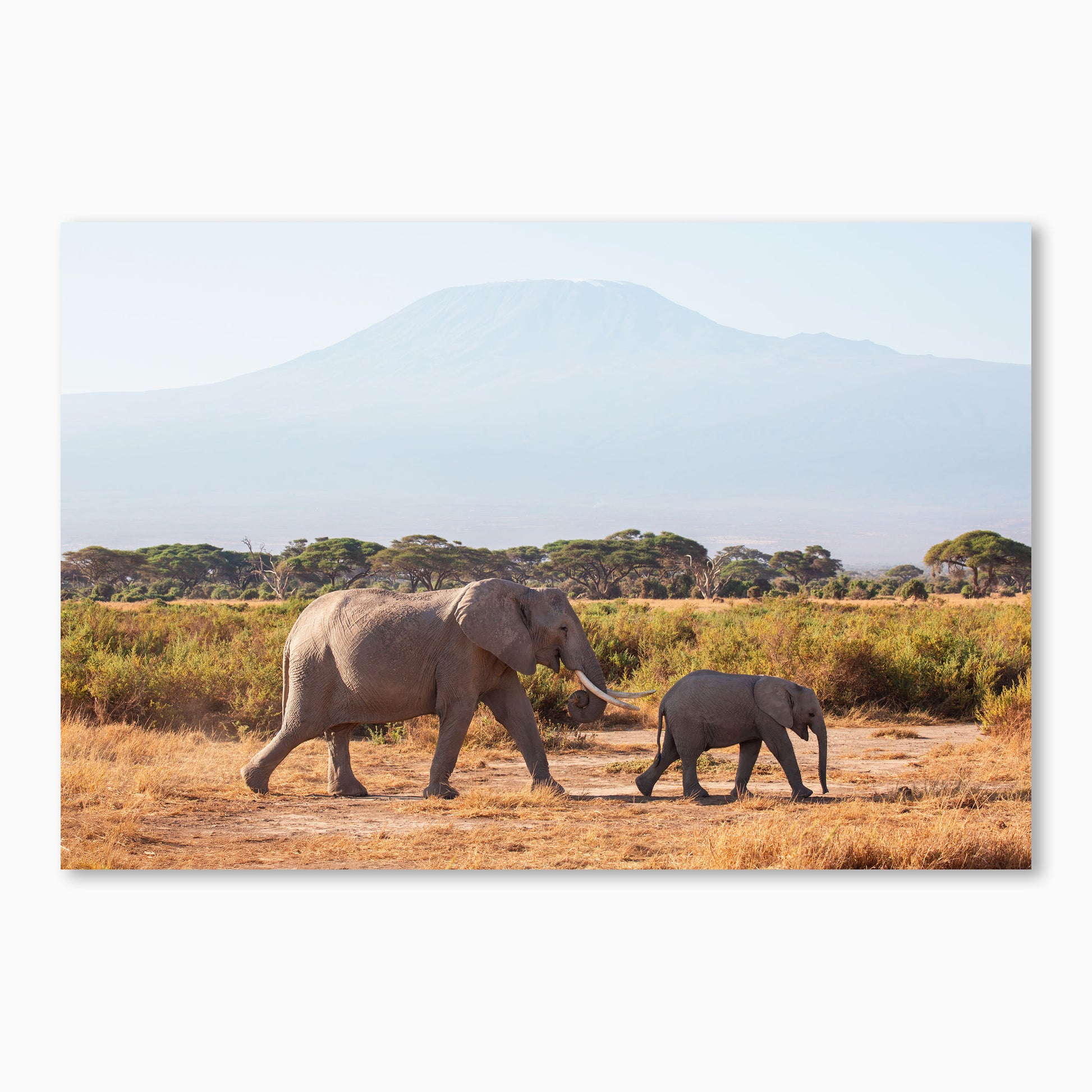 A mother elephant and her calf stroll across the golden grasslands of Amboseli National Park, with the majestic Mount Kilimanjaro rising in the distance. This peaceful moment captures the beauty of the African wilderness and the gentle bond between parent and baby.