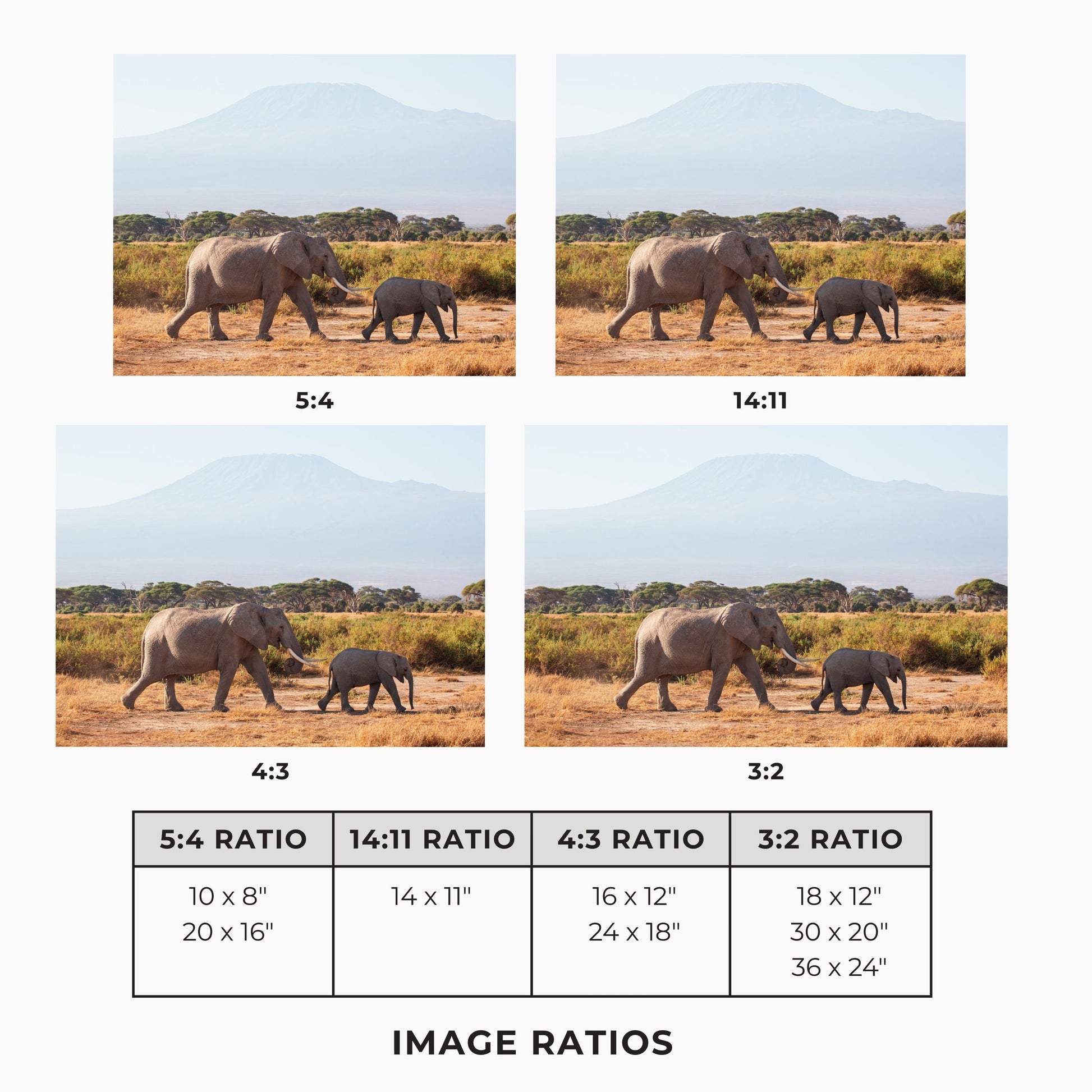 The print sizes available are designed to fit a variety of ready-made frame sizes that are available in stores. These different sizes will result in cropping of the original image. To ensure you're happy with the final look, please refer to the example image of how the artwork will appear in each size option.