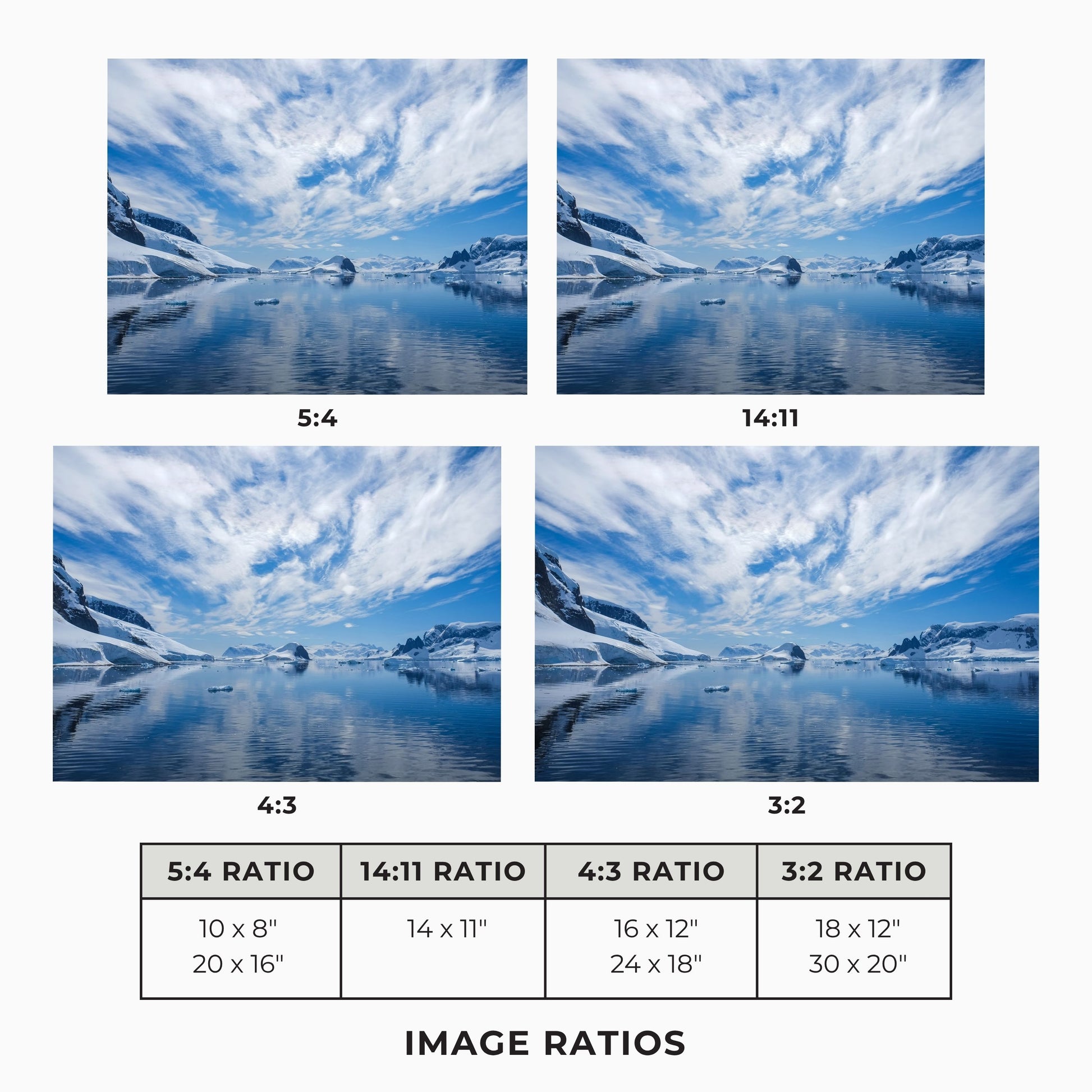 The print sizes available are designed to fit a variety of ready-made frame sizes that are available in stores. These different sizes will result in cropping of the original image. To ensure you're happy with the final look, please refer to the example image of how the artwork will appear in each size option.