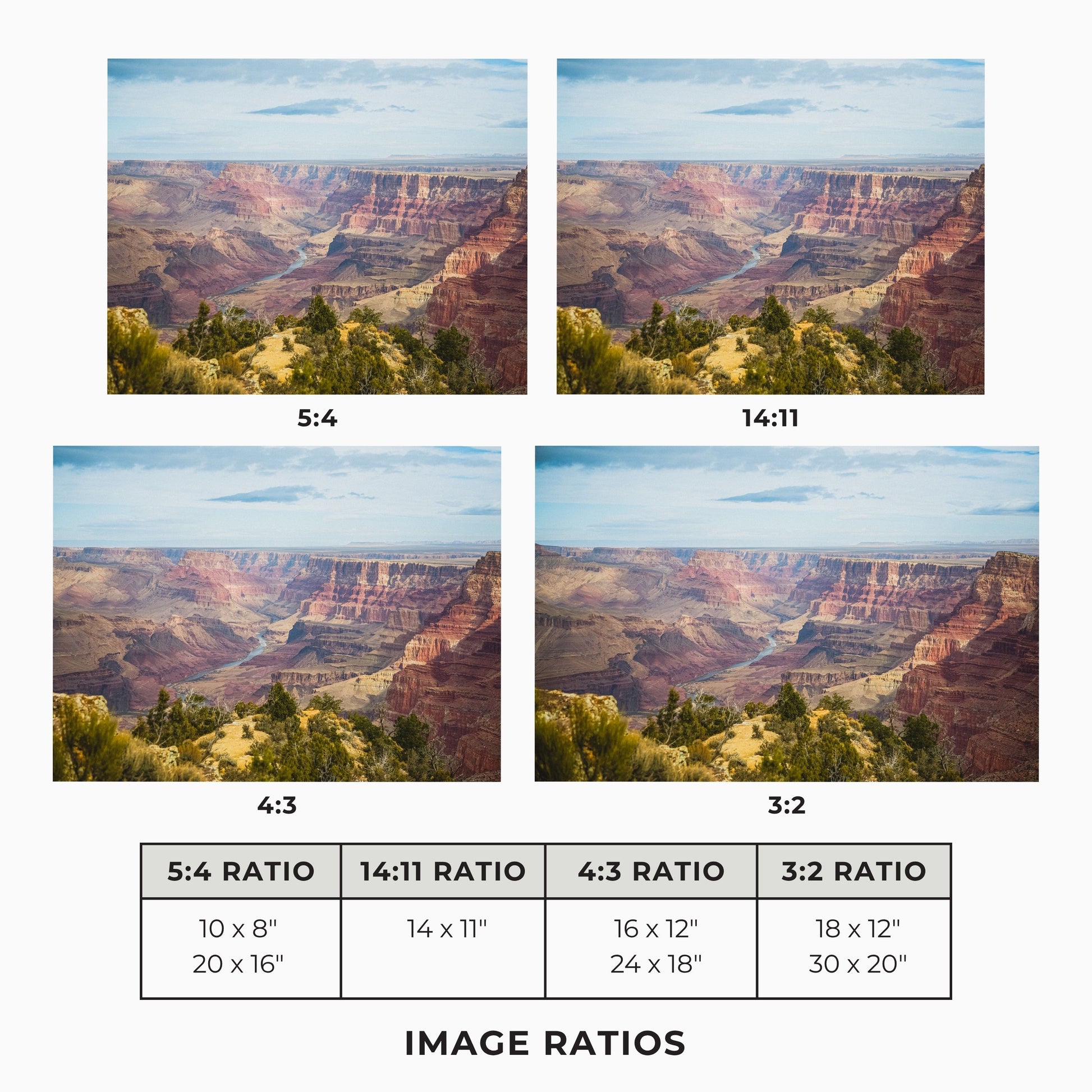 The print sizes available are designed to fit a variety of ready-made frame sizes that are available in stores. These different sizes will result in cropping of the original image. To ensure you're happy with the final look, please refer to the example image of how the artwork will appear in each size option.