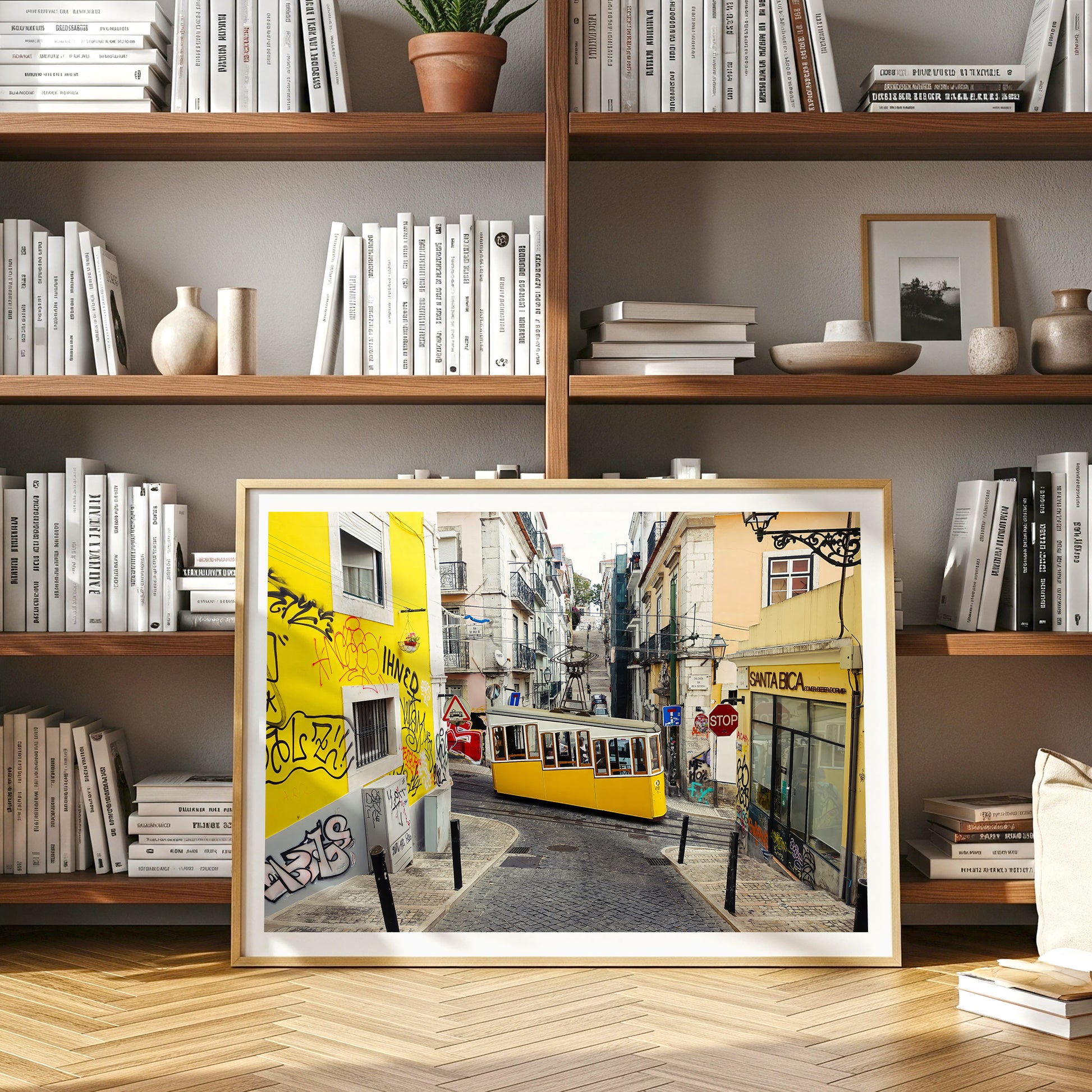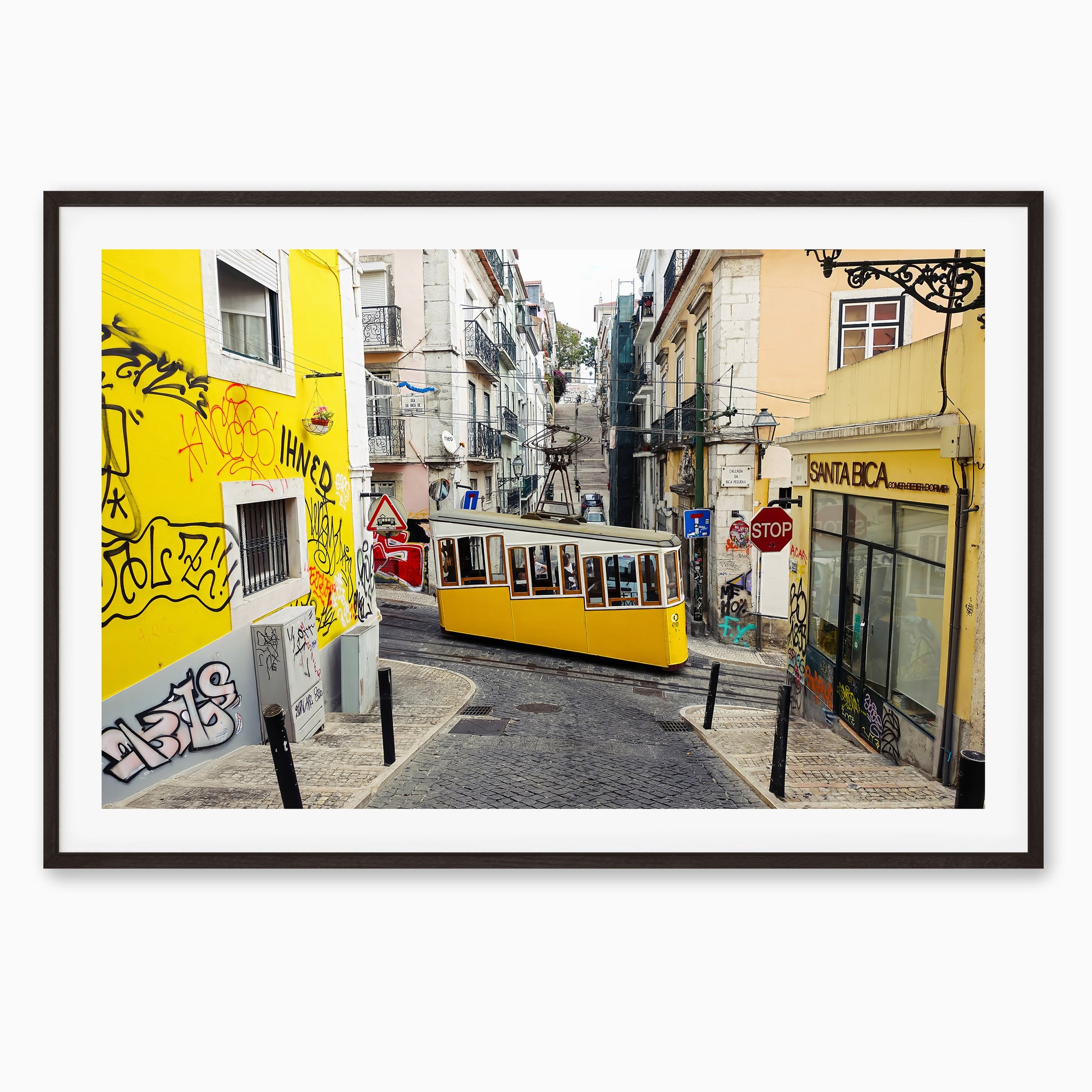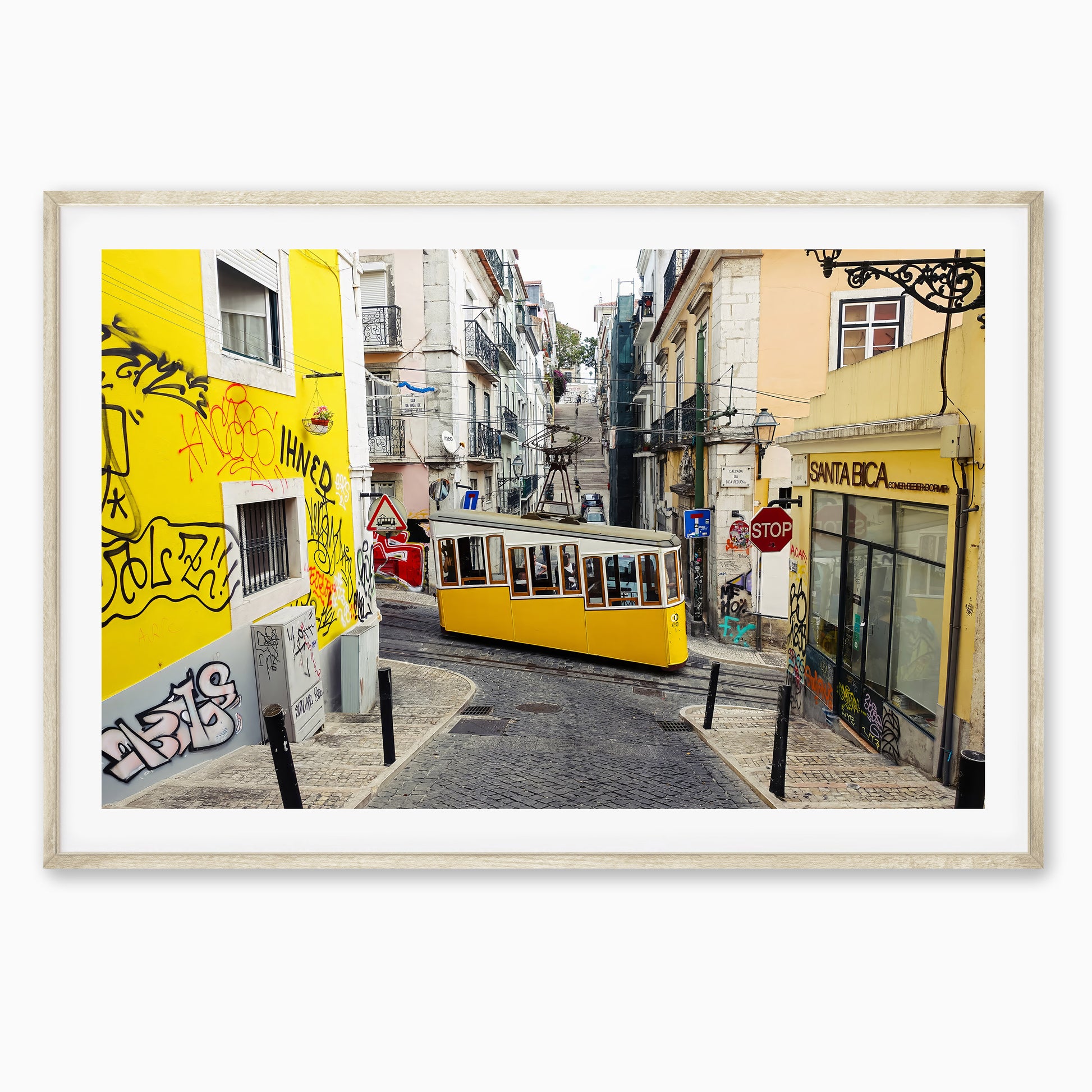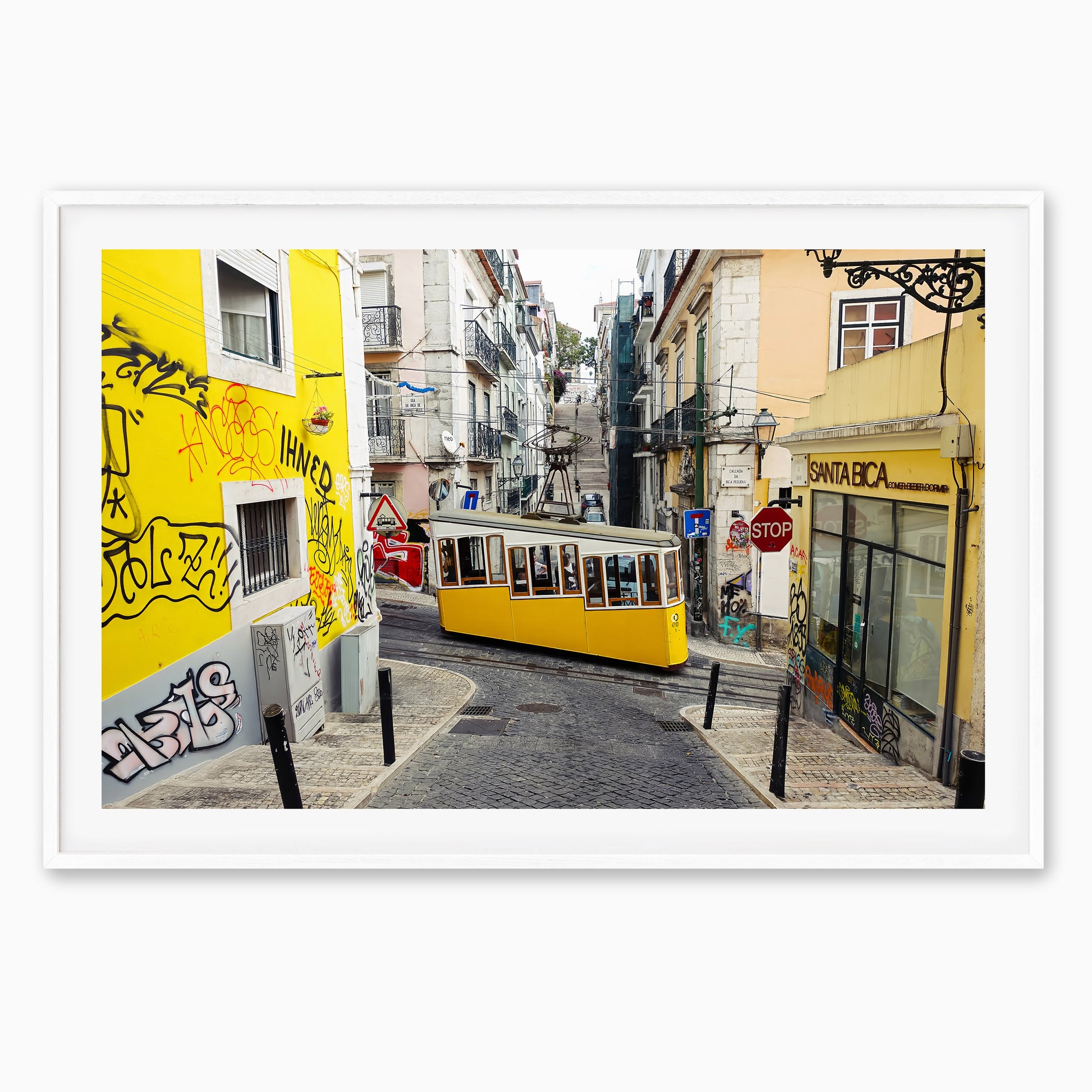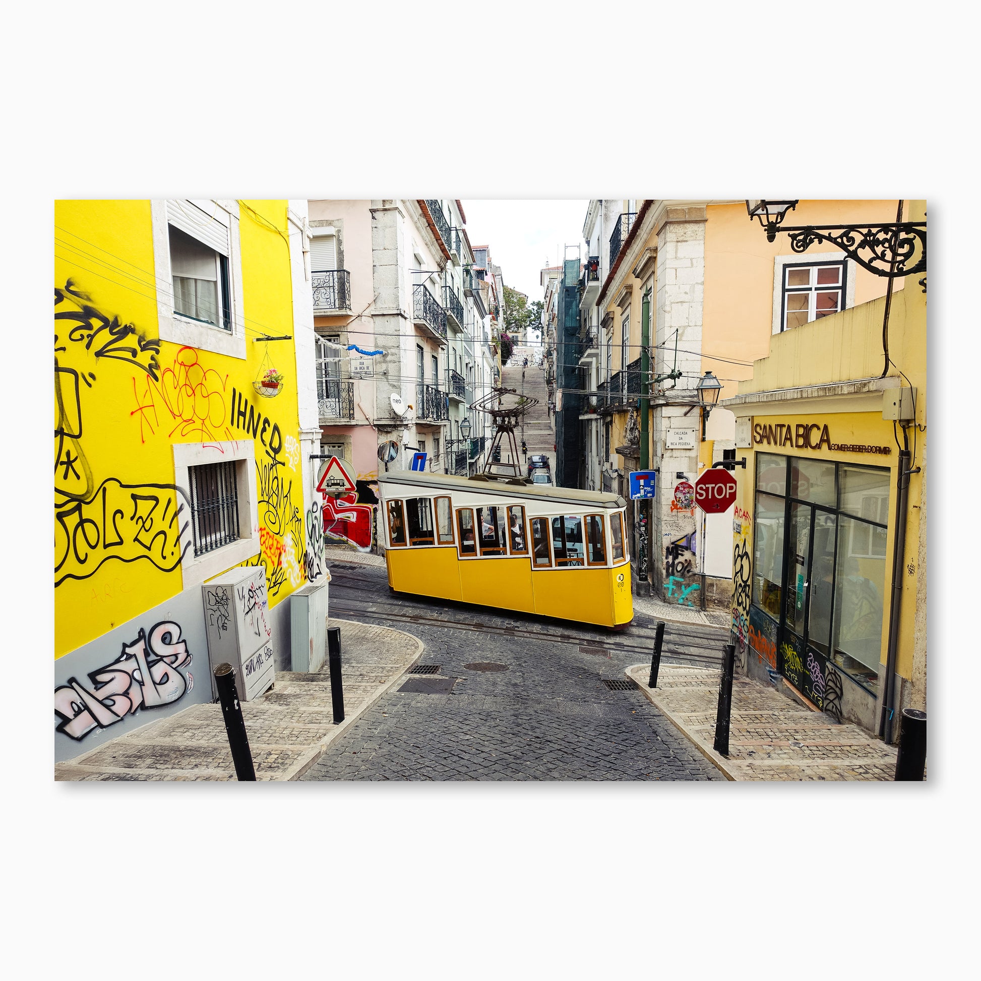 The iconic yellow Bica Funicular winds its way through the steep, narrow streets of Lisbon’s Bairro Alto district. Surrounded by colourful buildings, street art, and the charm of old cobblestones, this lively scene captures the vibrant energy and character of Portugal’s capital. A must-have print for lovers of travel, urban life, and European charm.