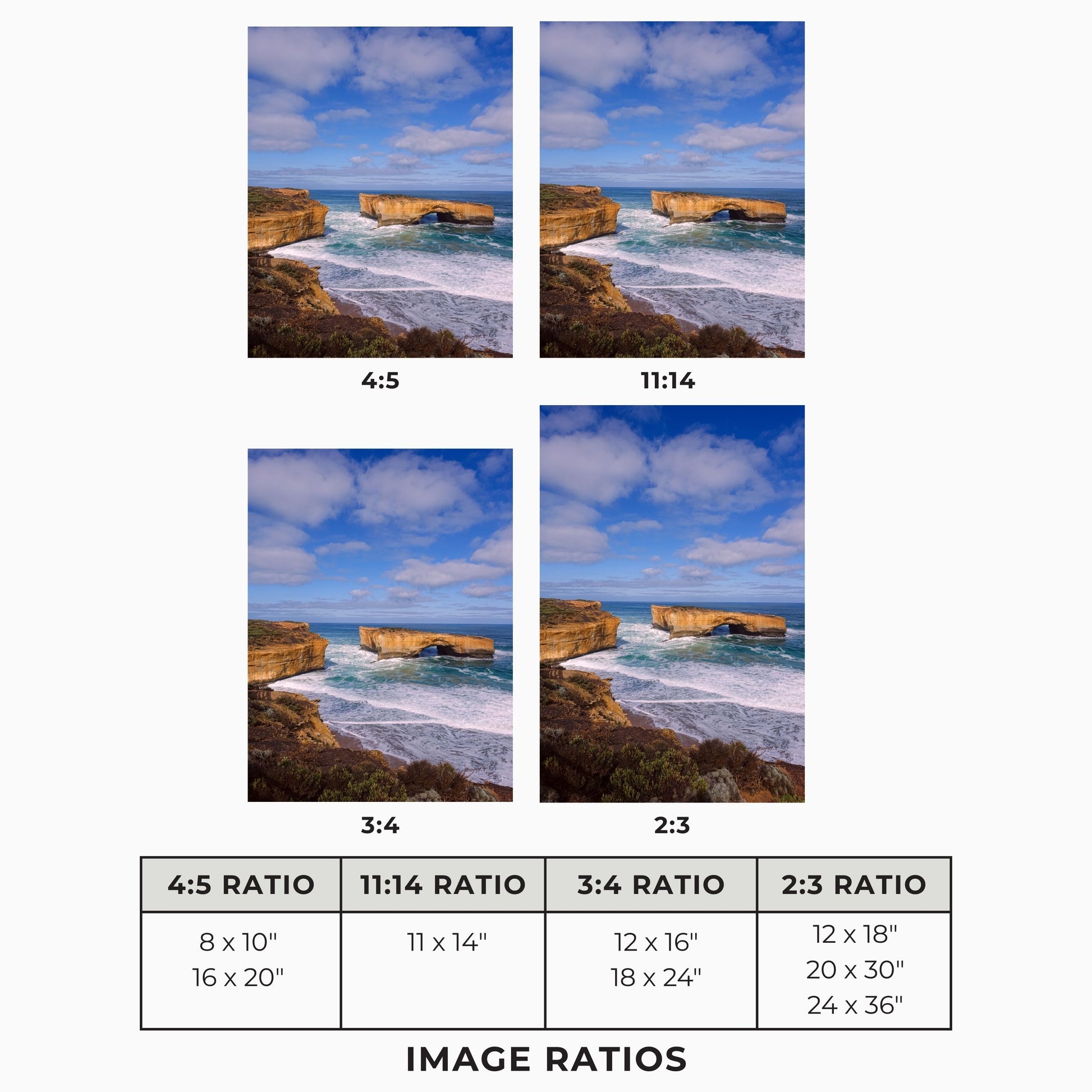 The print sizes available are designed to fit a variety of ready-made frame sizes that are available in stores. These different sizes will result in cropping of the original image. To ensure you're happy with the final look, please refer to the example image of how the artwork will appear in each size option.