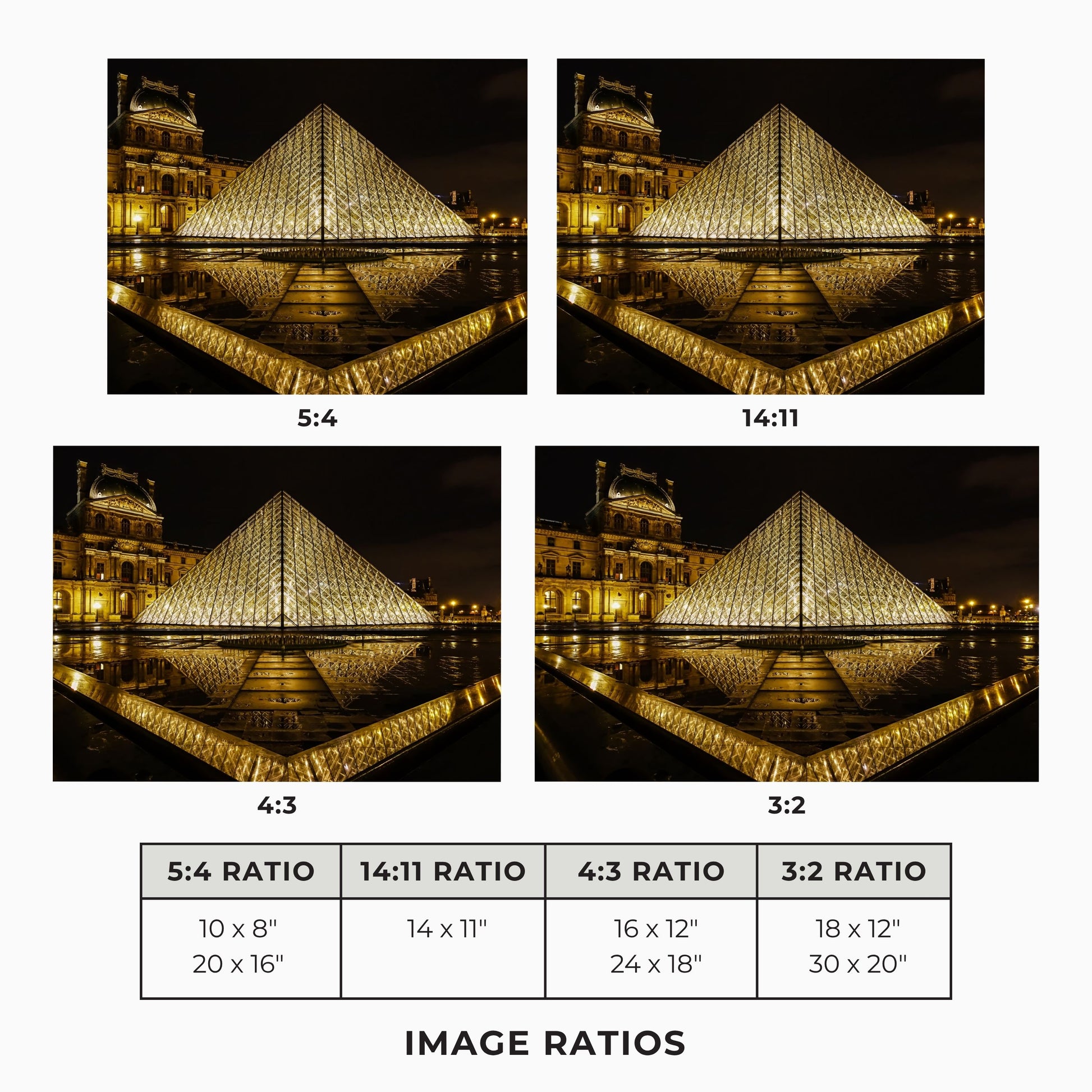 The print sizes available are designed to fit a variety of ready-made frame sizes that are available in stores. These different sizes will result in cropping of the original image. To ensure you're happy with the final look, please refer to the example image of how the artwork will appear in each size option.