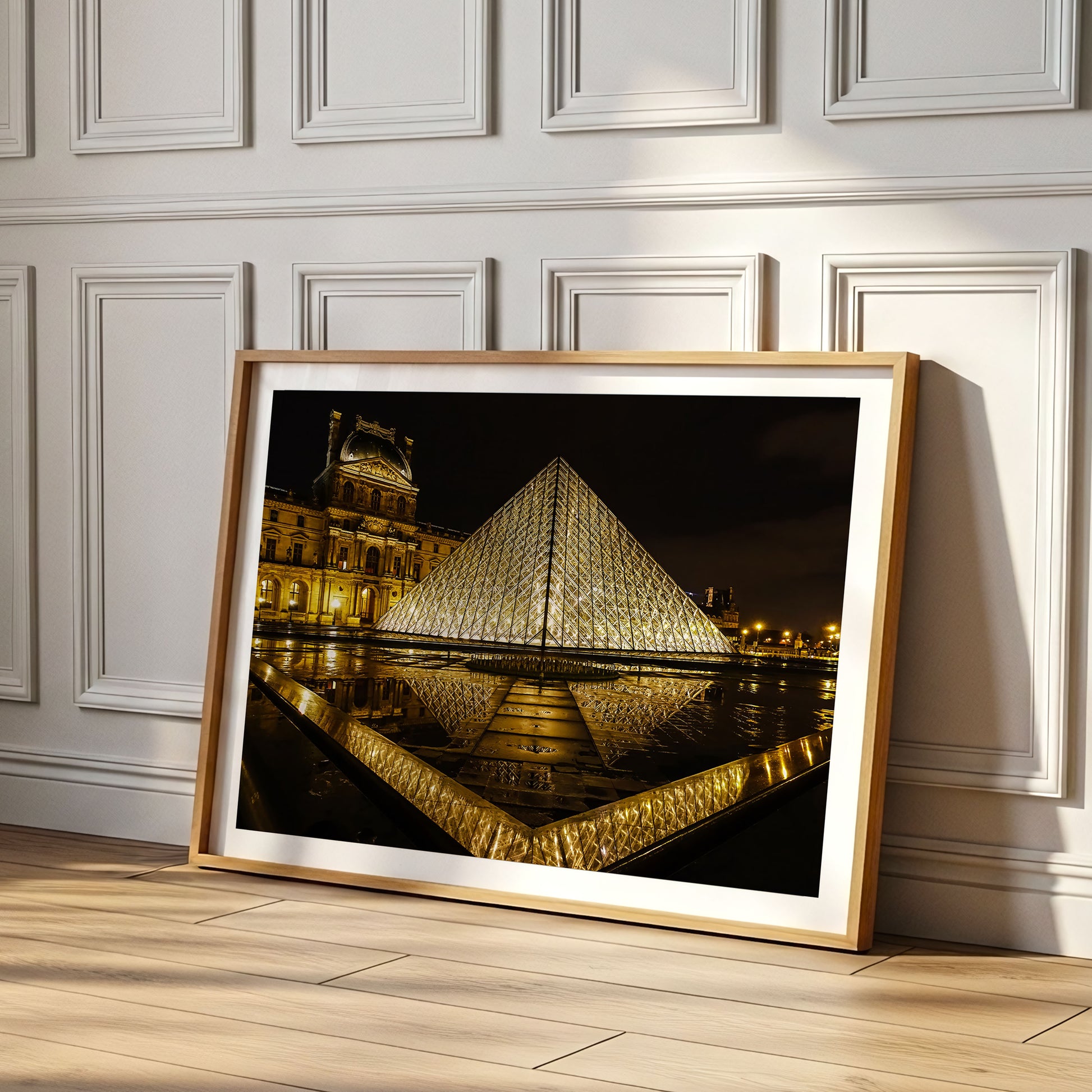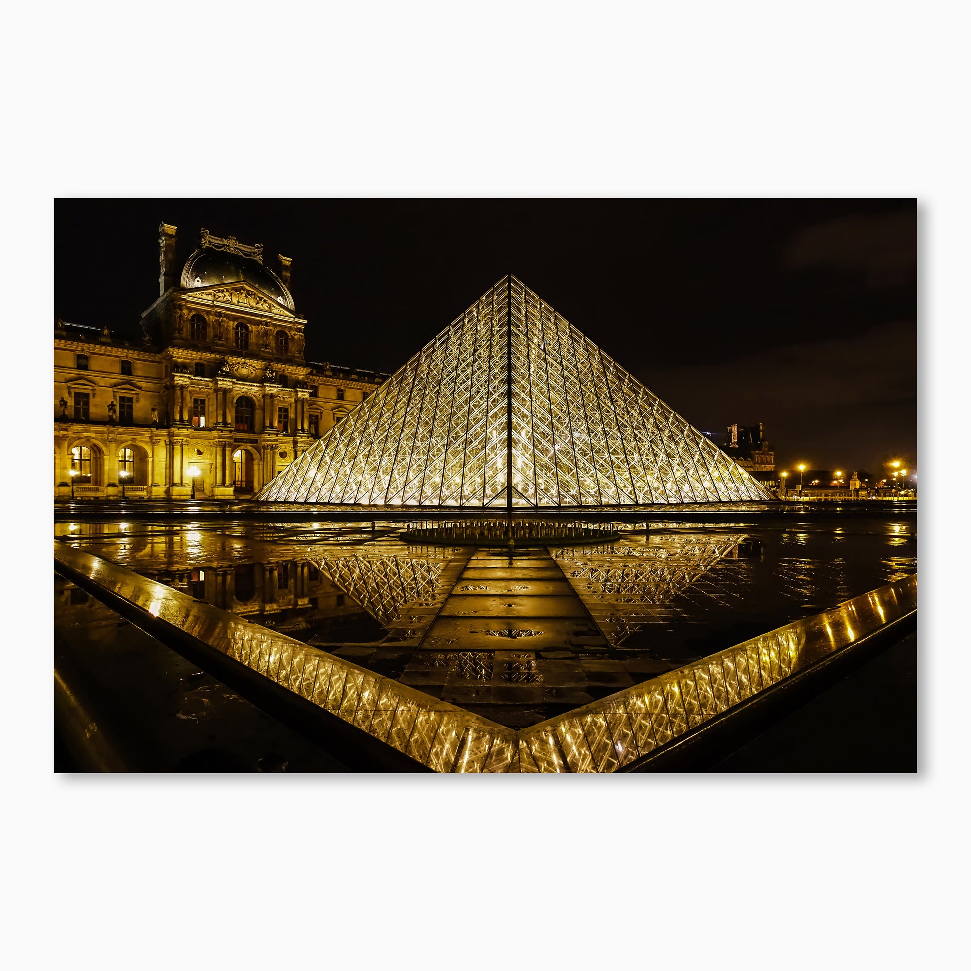 A striking nighttime view of the Louvre Pyramid in Paris, captured in perfect symmetry and glowing golden light. The glass panels shimmer against the black sky, reflected flawlessly in the water below, while the historic palace stands proudly behind. This image captures the contrast of old and new—elegance, precision, and architectural brilliance. A must-have print for lovers of Paris, art, and atmospheric urban photography.