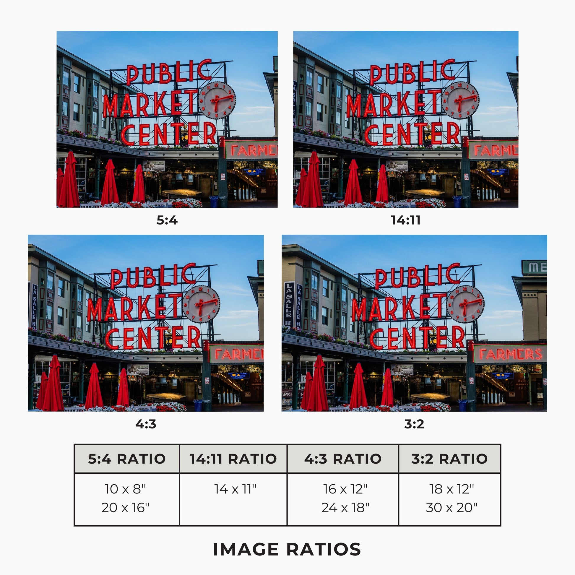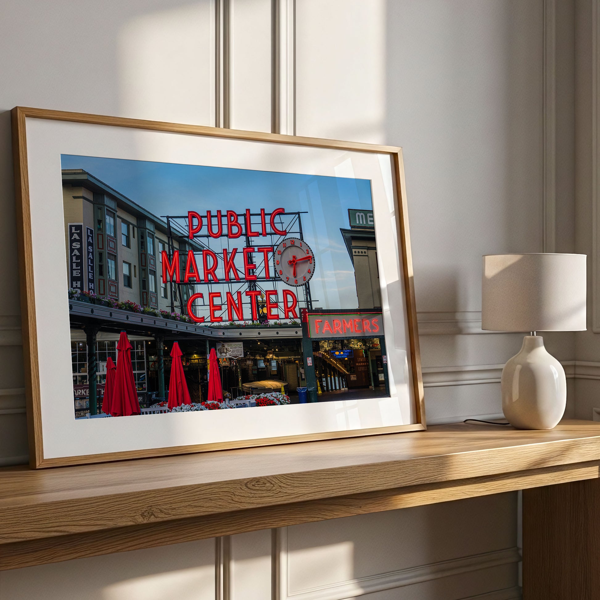 Captured in the quiet stillness of early morning, this photo showcases Seattle’s iconic Pike Place Market just before the hustle begins. The bold red neon sign is still glowing against the soft dawn sky, while the empty stalls and folded umbrellas hint at the flurry of activity to come. For anyone who’s grabbed a first coffee nearby or wandered the empty cobblestones at sunrise, this print is a nostalgic nod to the peaceful side of a place known for its energy.
