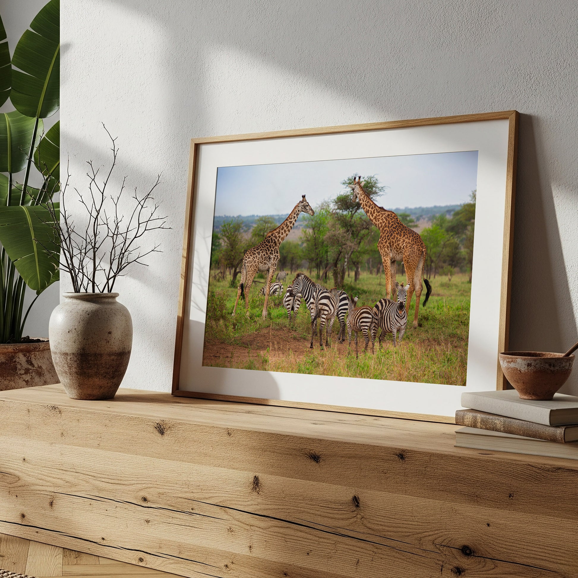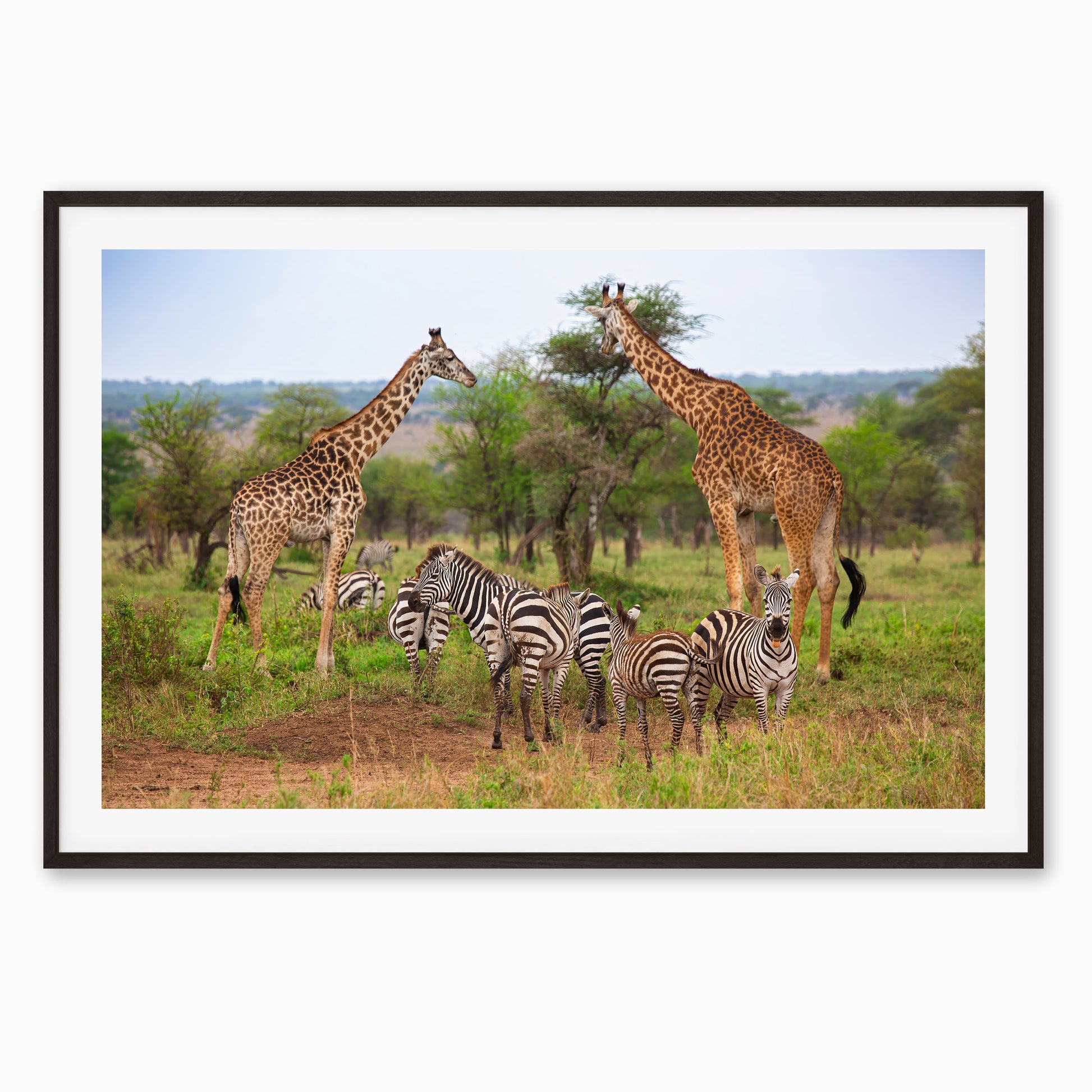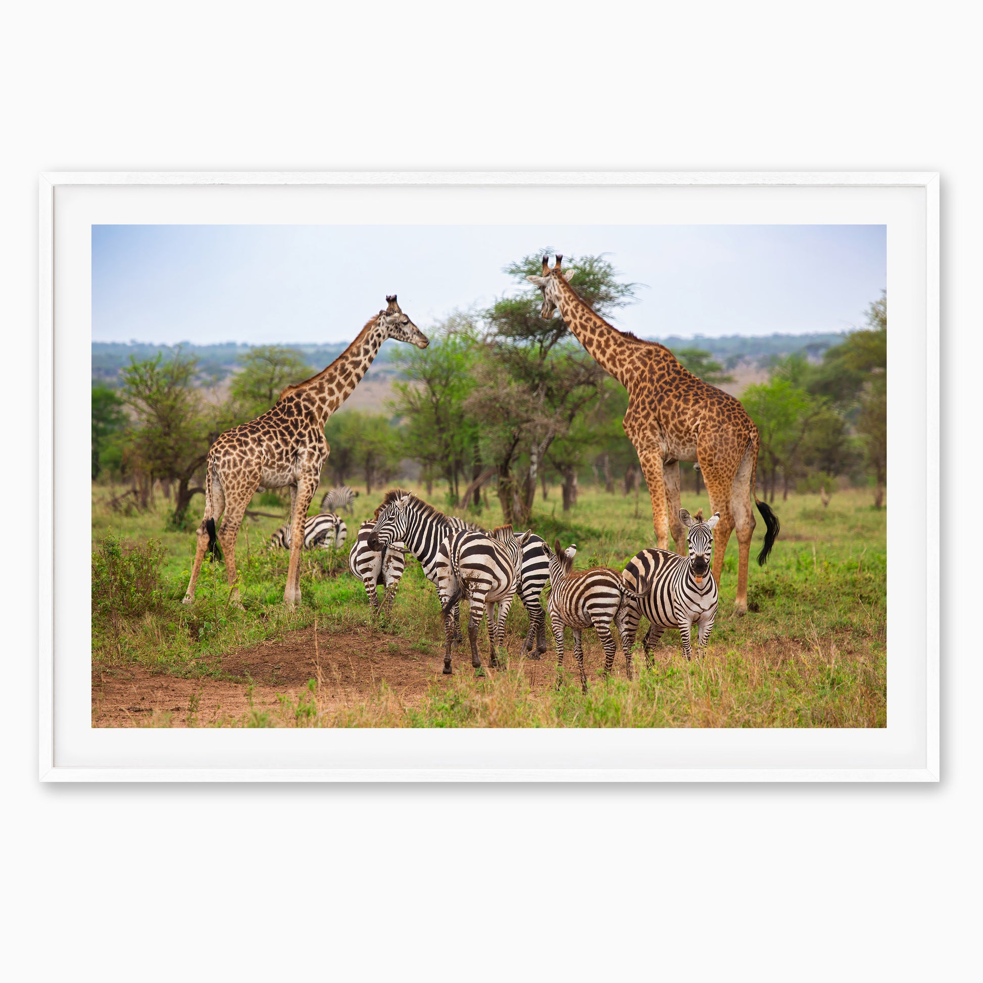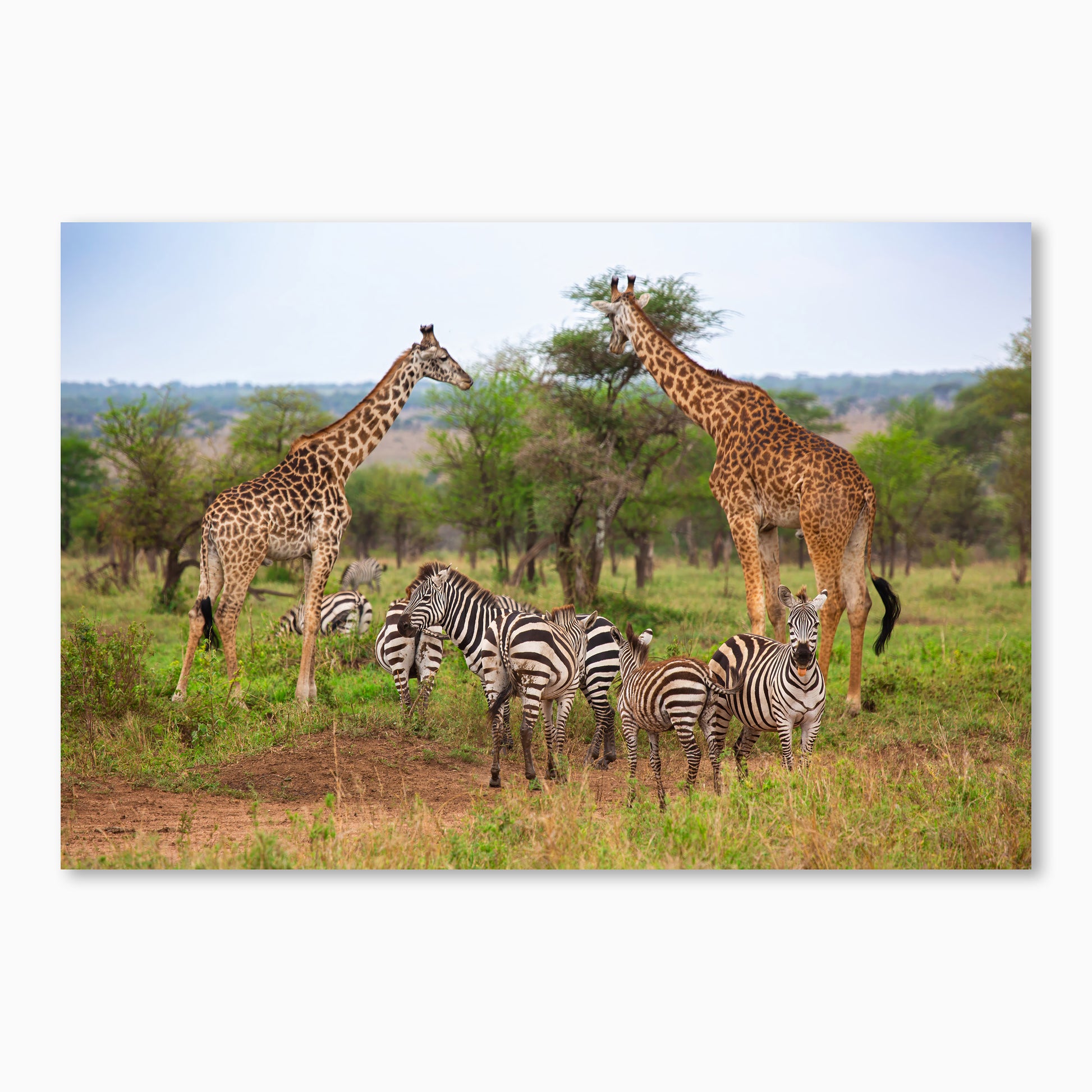 A classic safari moment comes to life with zebras and giraffes sharing the grassy plains of Africa. This relaxed scene captures the beauty of wildlife in its natural habitat—striped and spotted, tall and small, all coexisting under the open sky. A perfect print for anyone who loves animals, adventure, or dreams of an African safari.
