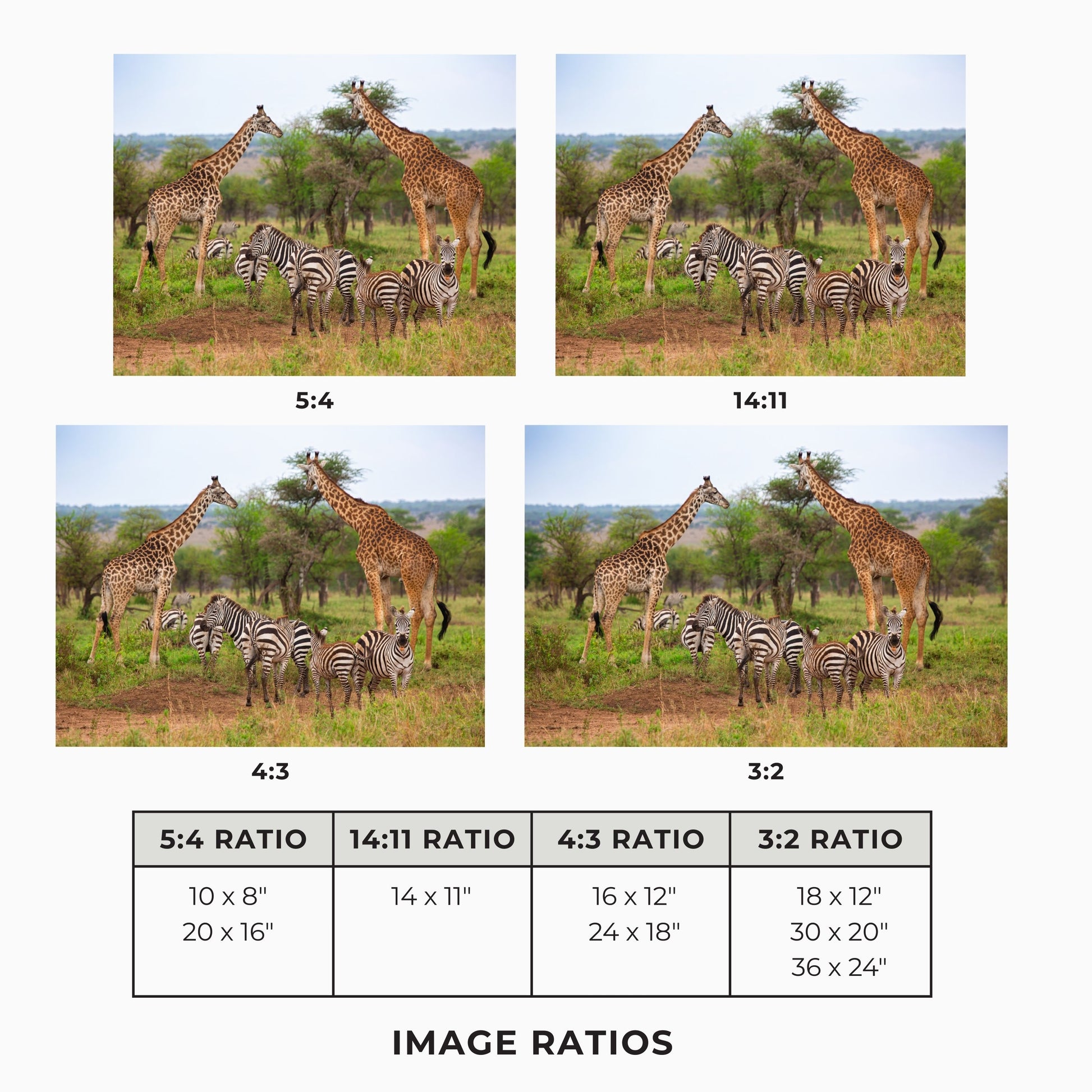 The print sizes available are designed to fit a variety of ready-made frame sizes that are available in stores. These different sizes will result in cropping of the original image. To ensure you're happy with the final look, please refer to the example image of how the artwork will appear in each size option.