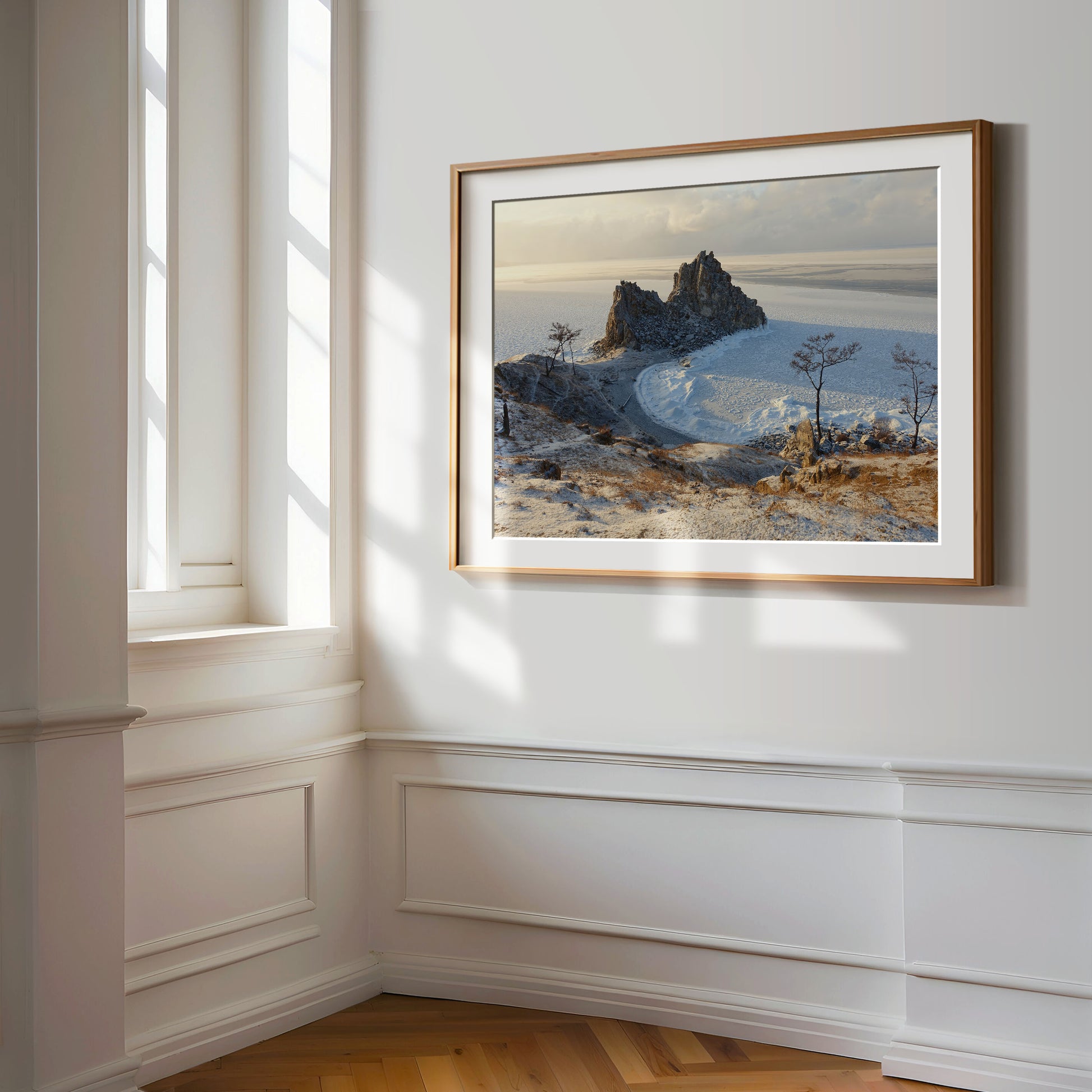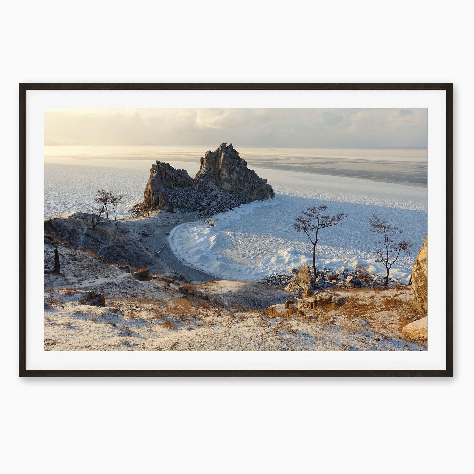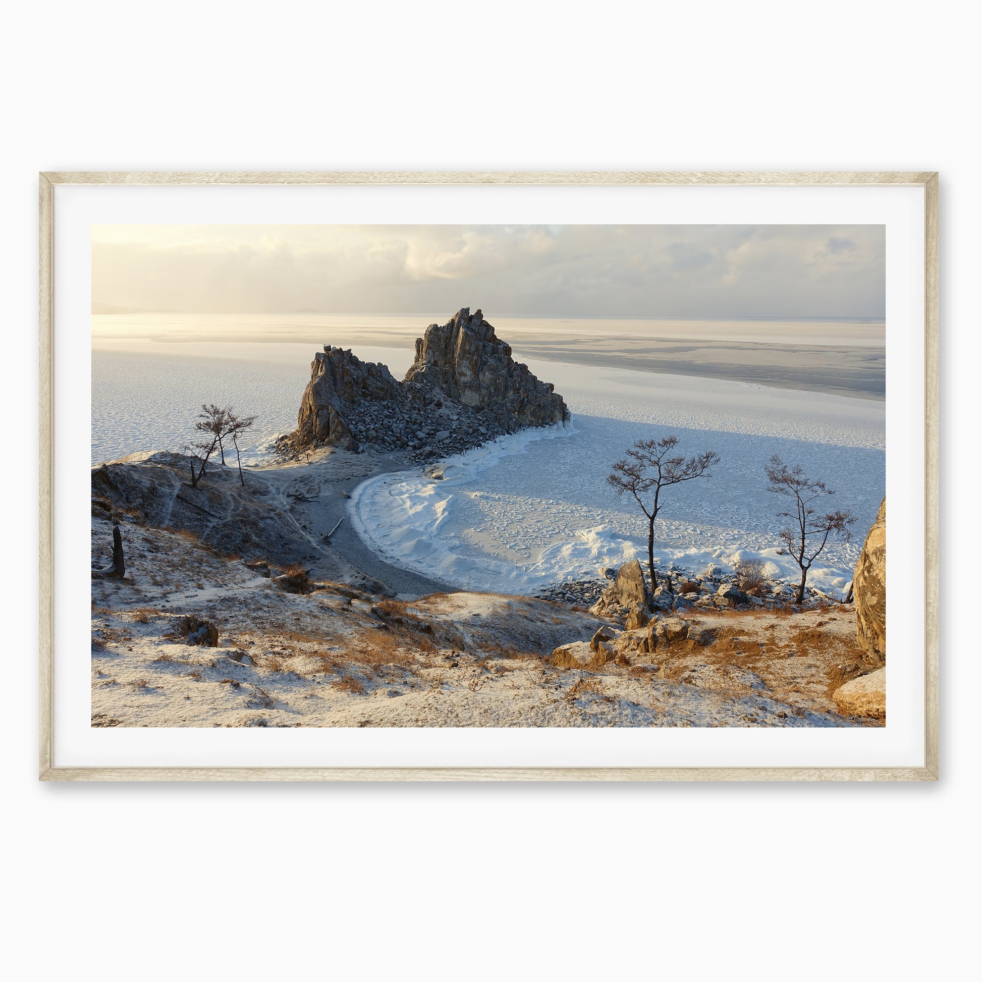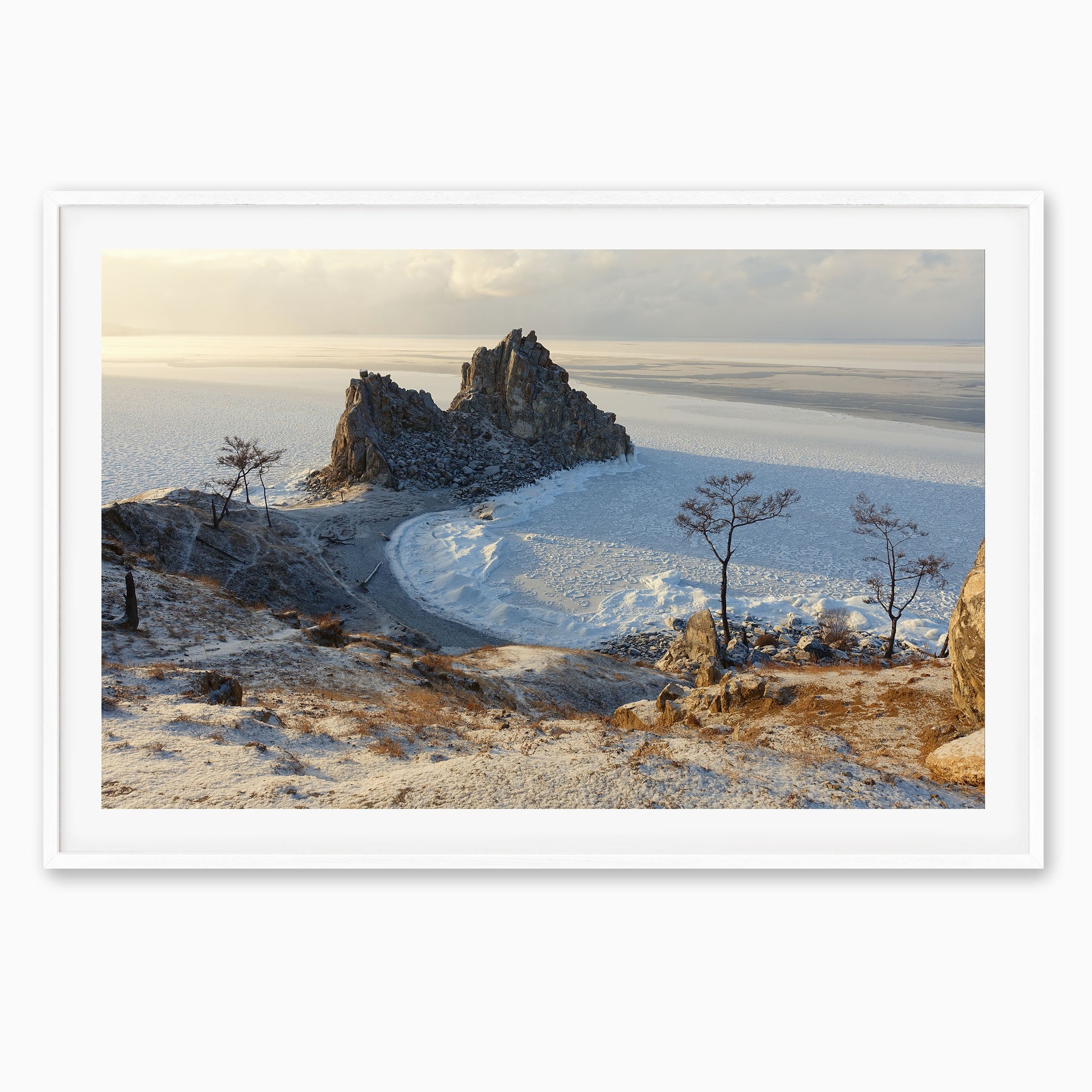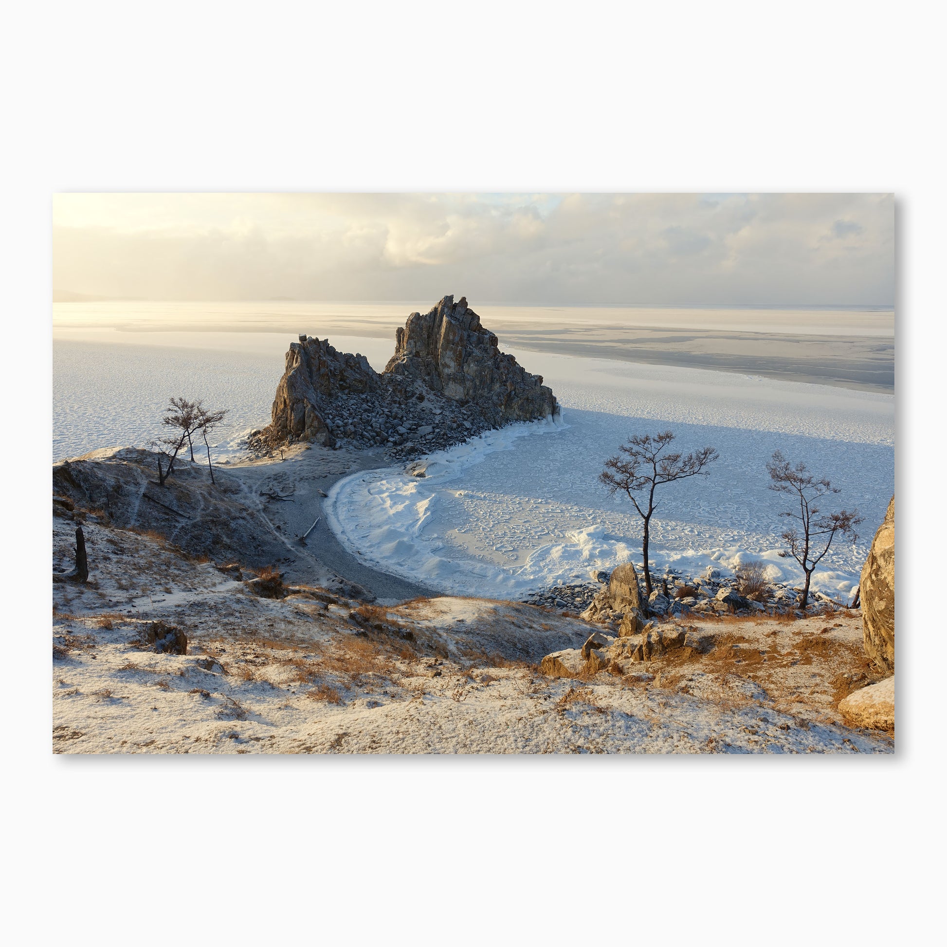 This moment was captured at Shaman Rock on a frozen evening by Lake Baikal—just as the soft winter light washed over the ice and turned everything golden. Standing there in the silence, with only the crunch of snow underfoot and the vastness of Siberia stretching out before you feels like time has paused. This print is a reflection of that peaceful, surreal stillness. If you’ve been there, you’ll know the magic.