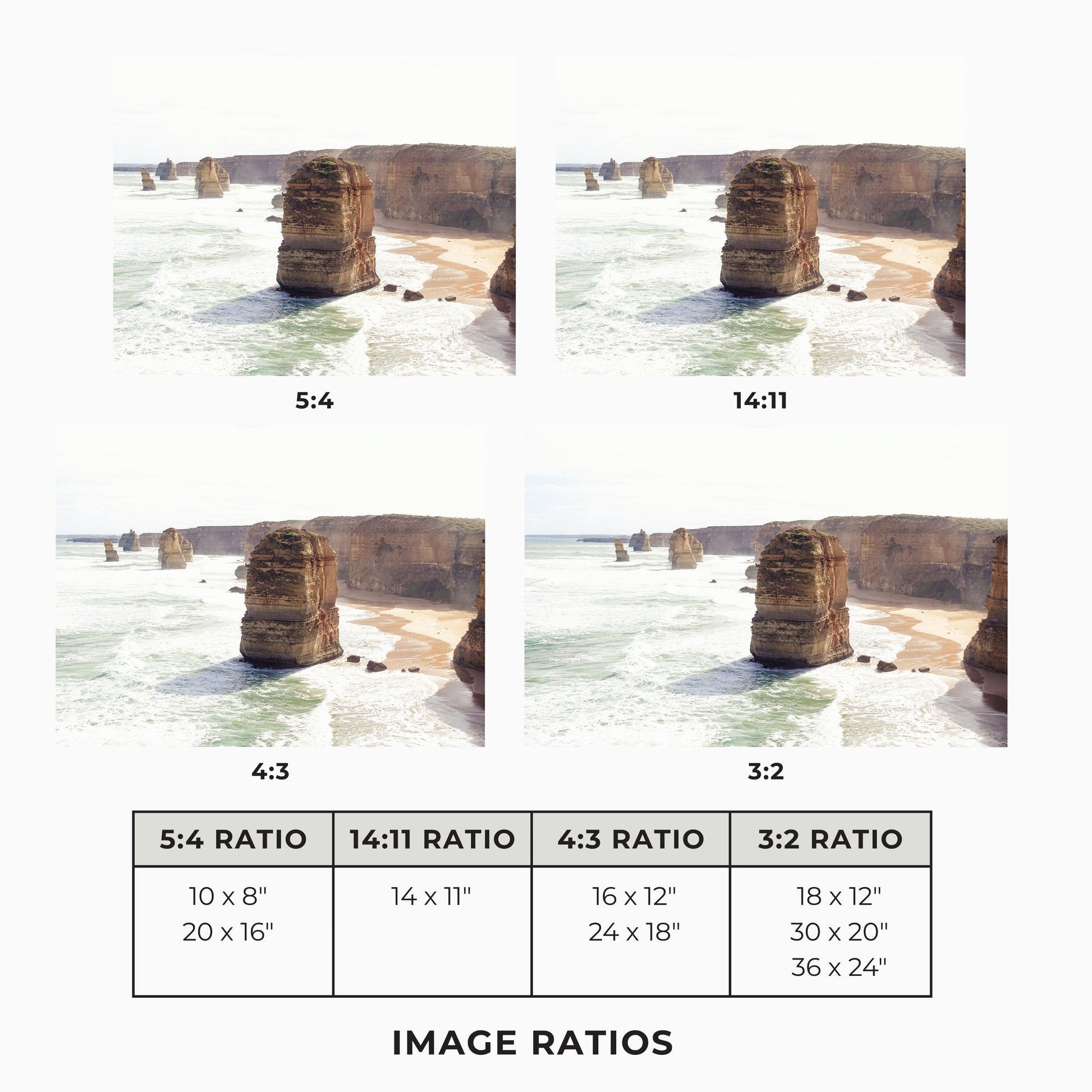 The print sizes available are designed to fit a variety of ready-made frame sizes that are available in stores. These different sizes will result in cropping of the original image. To ensure you're happy with the final look, please refer to the example image of how the artwork will appear in each size option.